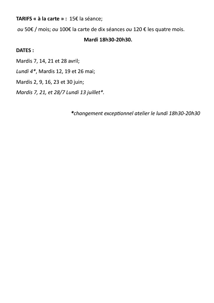 - Tarif indiv. adulte : 50,00 € - Tarif par mois (4 séances)