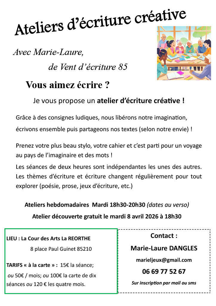 Vous aimez écrire ? Je vous propose un atelier d'écriture créative ! Grâce à des consignes ludiques, nous libérons notre imagination, écrivons ensemble puis partageons nos textes (selon notre envie !). Les séances de deux heures sont indépendantes les unes des autres. Les thèmes d'écriture changent chaque semaine pour tout explorer.
