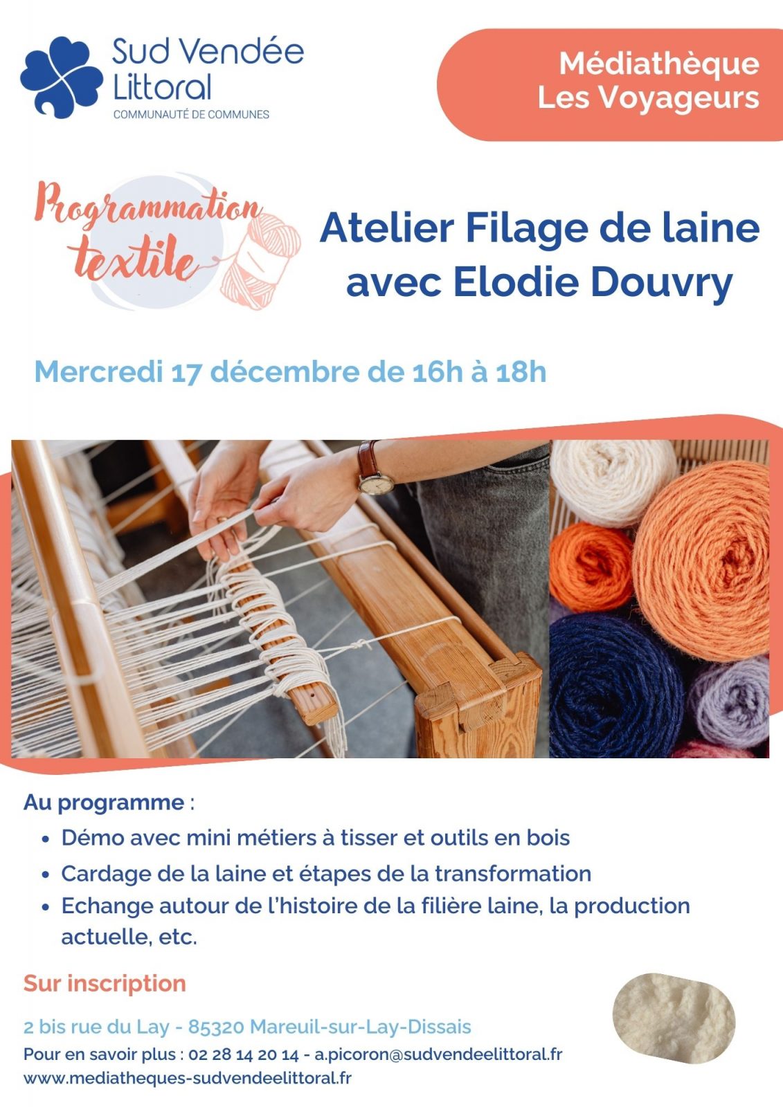 Dans le cadre de la Programmation Textile des Médiathèques Sud Vendée Littoral, Elodie Douvry vous accueille pour un moment autour du filage de la laine.
