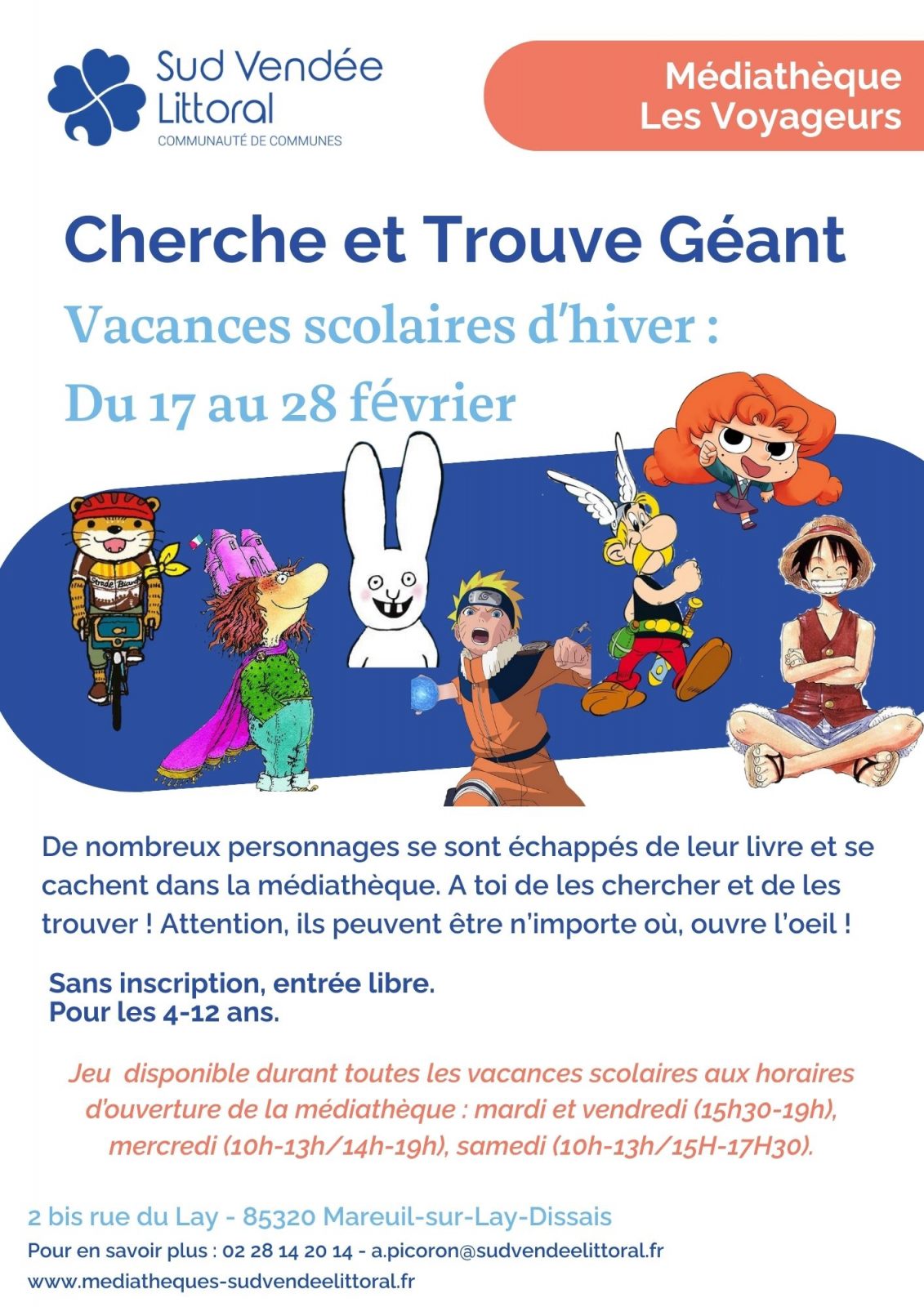 De nombreux personnages se sont échappés de leur livre et se cachent dans la médiathèque. A toi de les chercher et de les trouver ! Attention, ils peuvent être n’importe où, ouvre l’oeil !