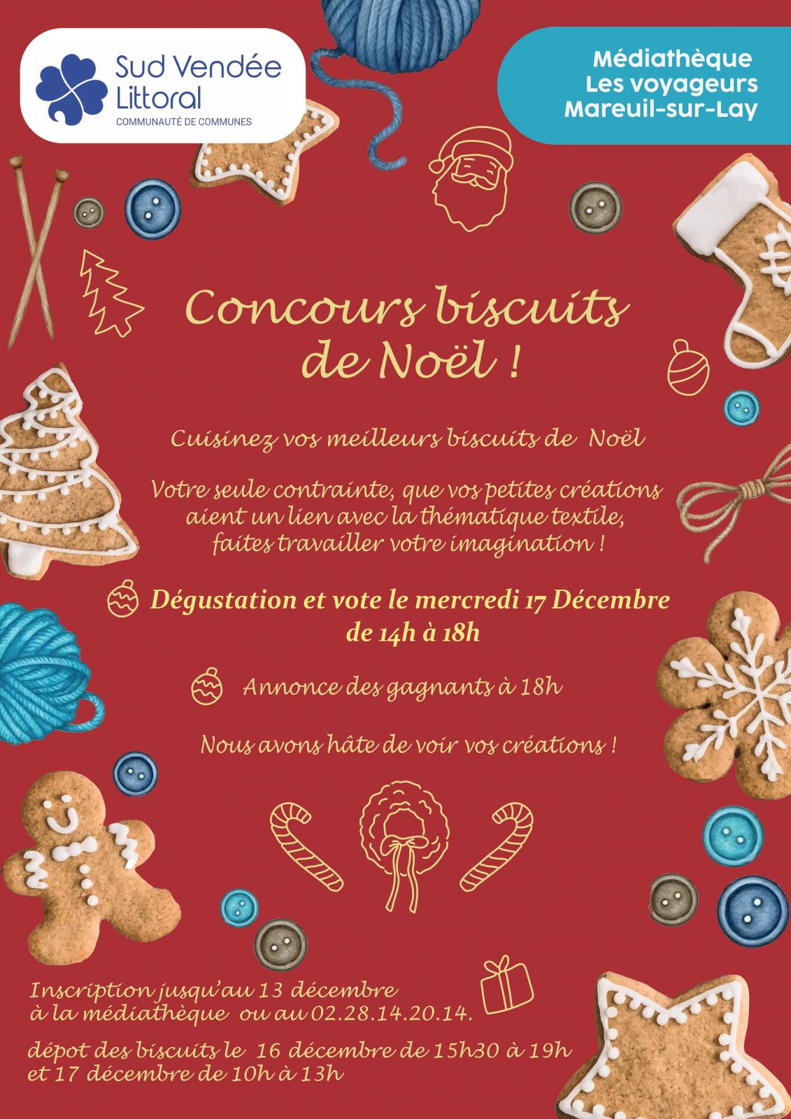 Les biscuits sont à déposer à la médiathèque le mardi 16 décembre de 15h30 à 19h ou le mercredi 17 décembre de 10h à 13h.