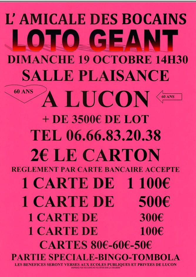60 ans de l'Amicale des Bocains Luçonnais. Lots : 1100, 500 etc. + de 3500 de lots