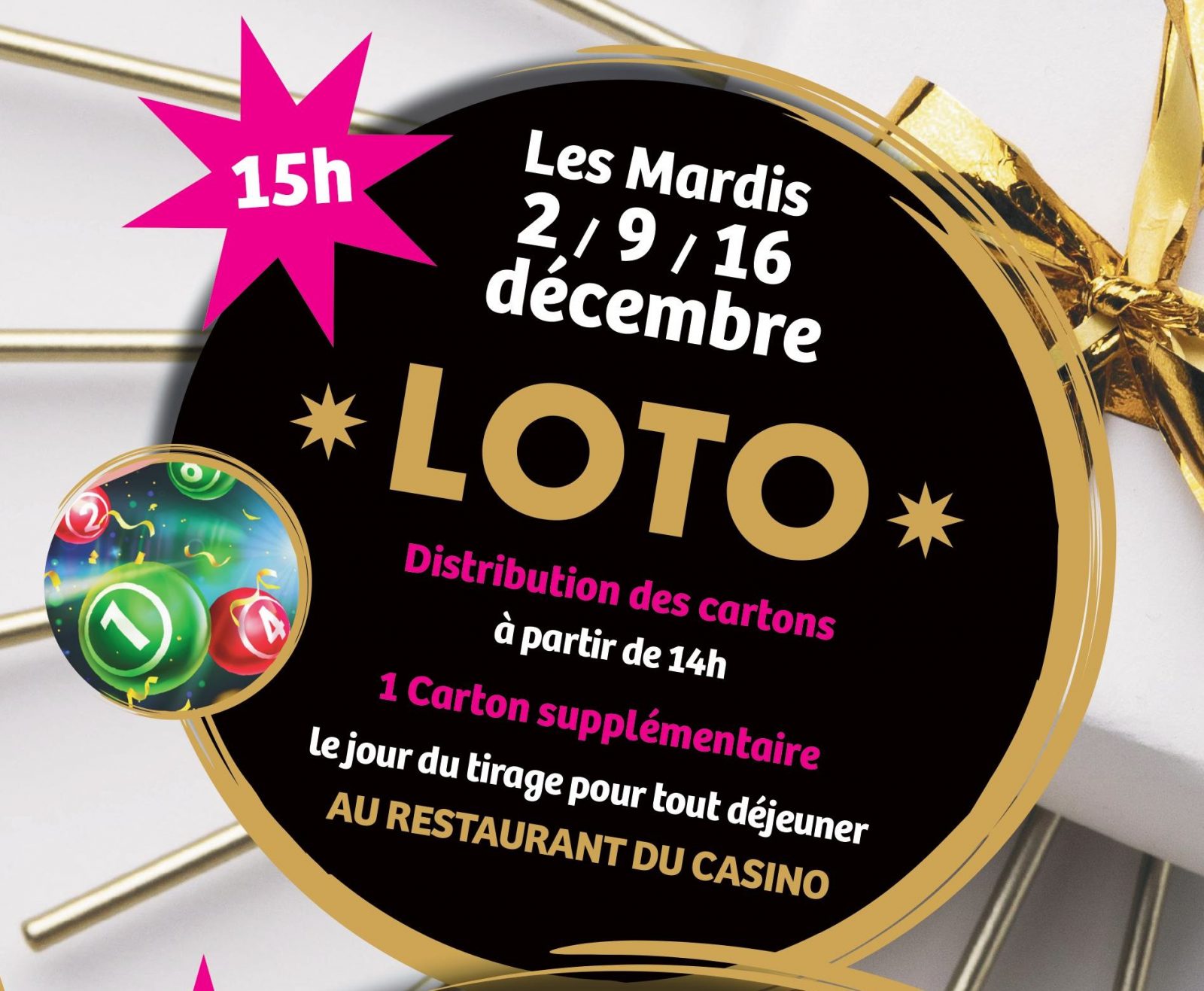 Distribution des cartons à partir de 14h, début du loto à 15 h. 1 carton supplémentaire pour tout déjeuner au Restaurant du Casino le jour du tirage du loto.