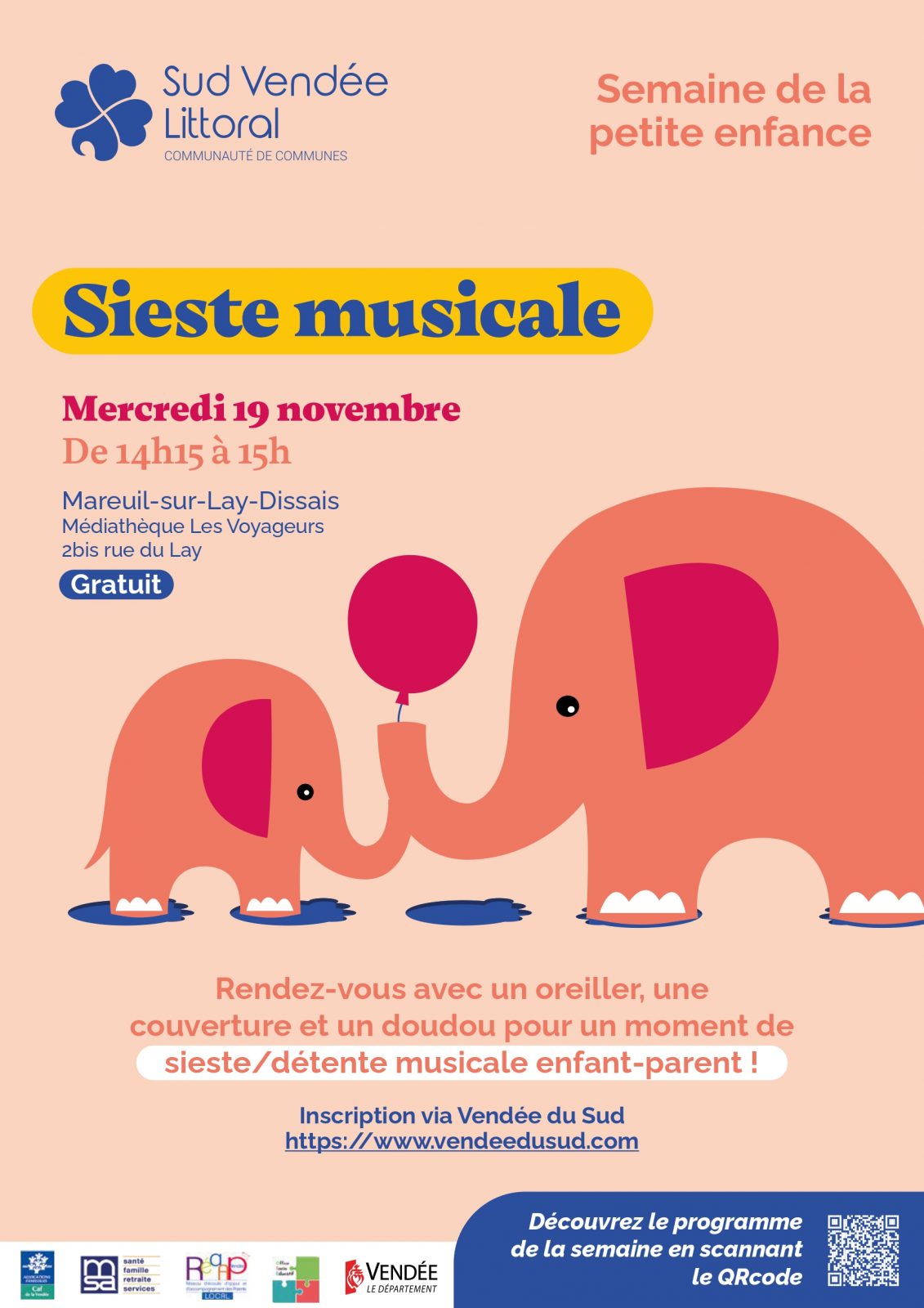 Rendez-vous à la médiathèque avec un oreiller, une couverture, un doudou.Installez-vous confortablement pour un moment de sieste/détente enfant-parent. Laissez-vous porter par les sons des instruments proposés par l'école de musique intercommunale. A partir de 4 ans.