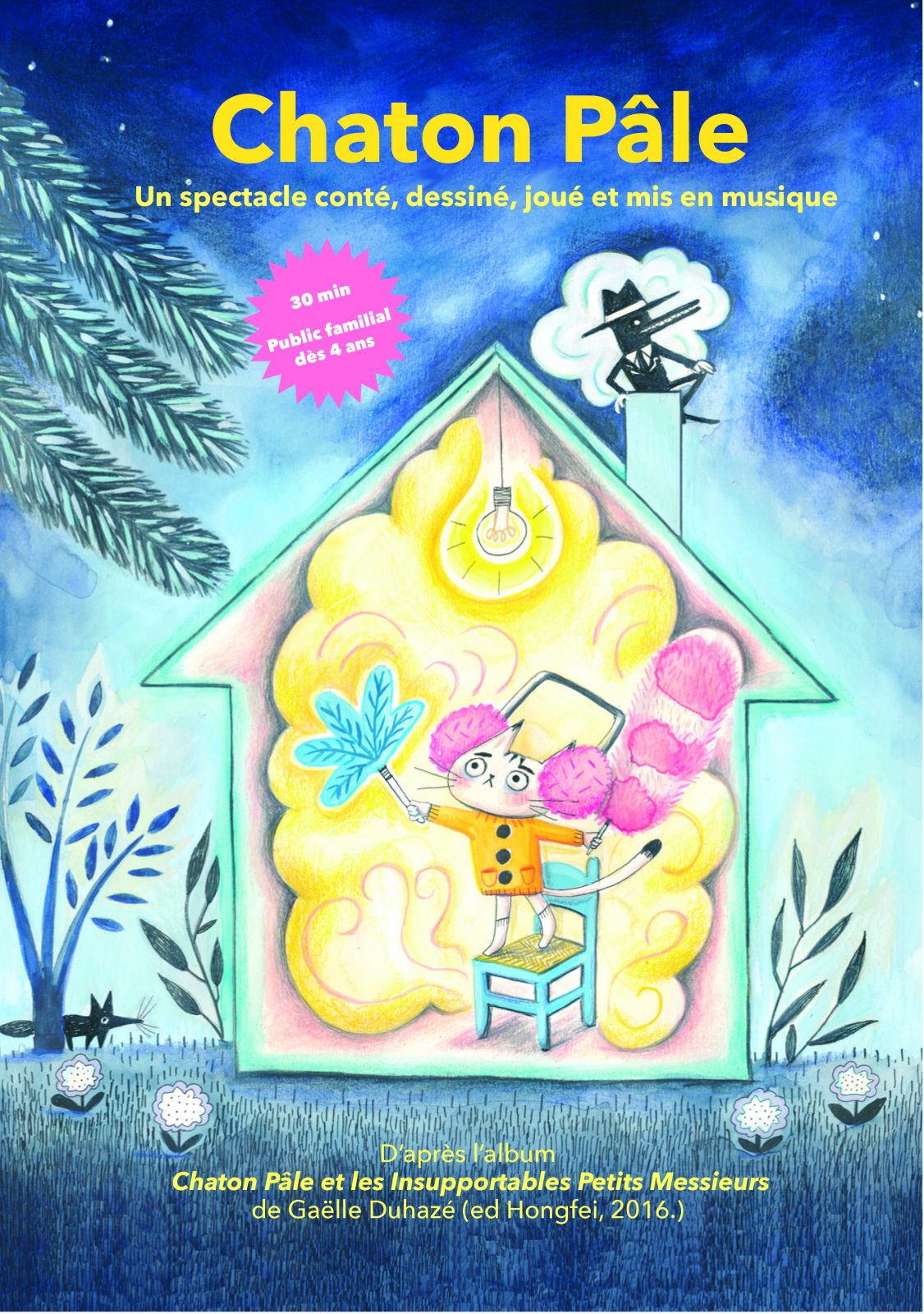 Chaton Pâle vit dans une jolie maison à l'orée du bois. Tout le monde l'appelle Chaton Pâle car il ne sort pas beaucoup de chez lui. Dès qu'il veut poser une patte dehors, les Insupportables Petits Messieurs apparaissent pour l'en dissuader... Un conte musical et dessiné, plein d'humour, d'émotions et de rebondissements, sur l'ouverture au monde, pour passer un moment poétique en famille !
