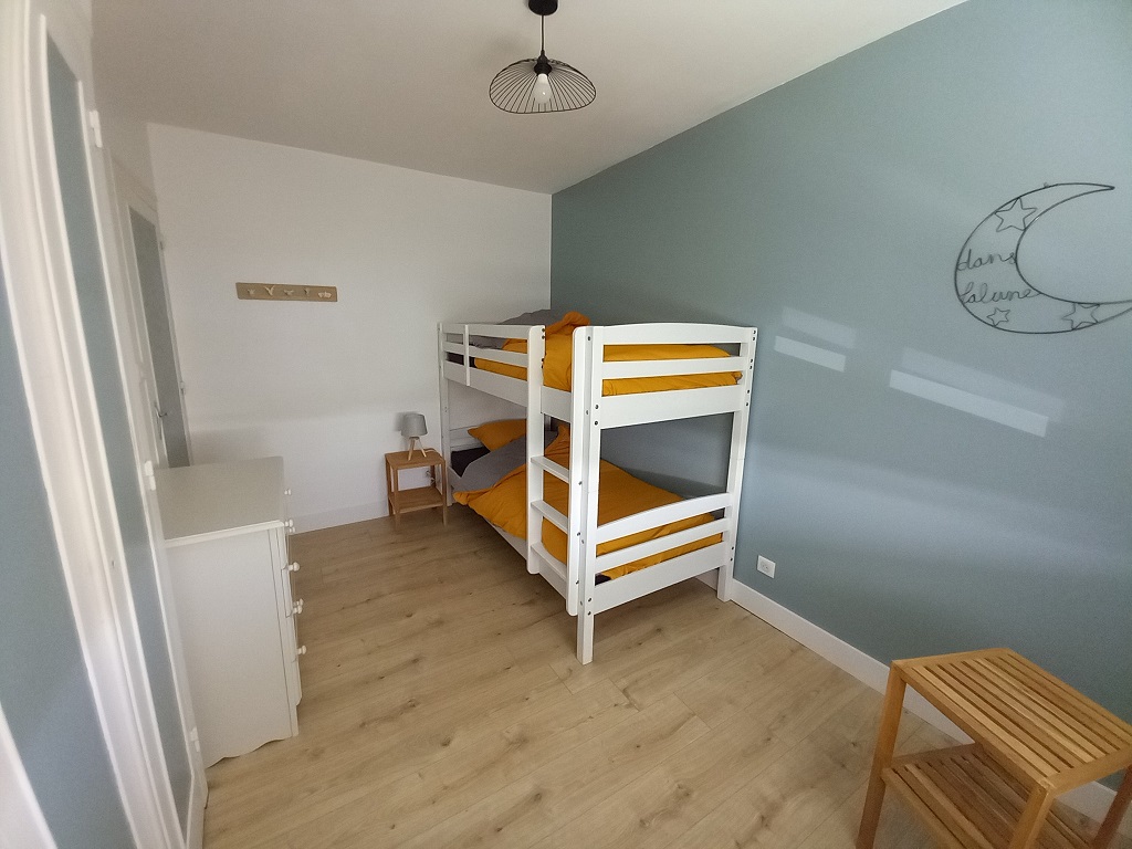 A l'étage : une salle d'eau avec douche et lavabo, un WC séparé, une chambre avec un lit double, une chambre avec lit superposé et une dernière chambre avec lits jumeaux.