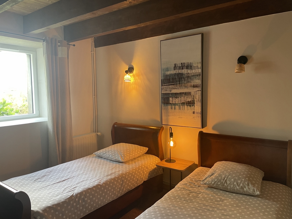 Le gîte est composé, au rez-de-chaussée, d'une cuisine aménagée, d'une salle à manger et d'un salon avec insert donnant sur les 2 pièces (bois fourni), d'une salle d’eau avec douche à l’italienne et WC, 1 chambre (2 lits 90) et 1 chambre (1 lit 140).