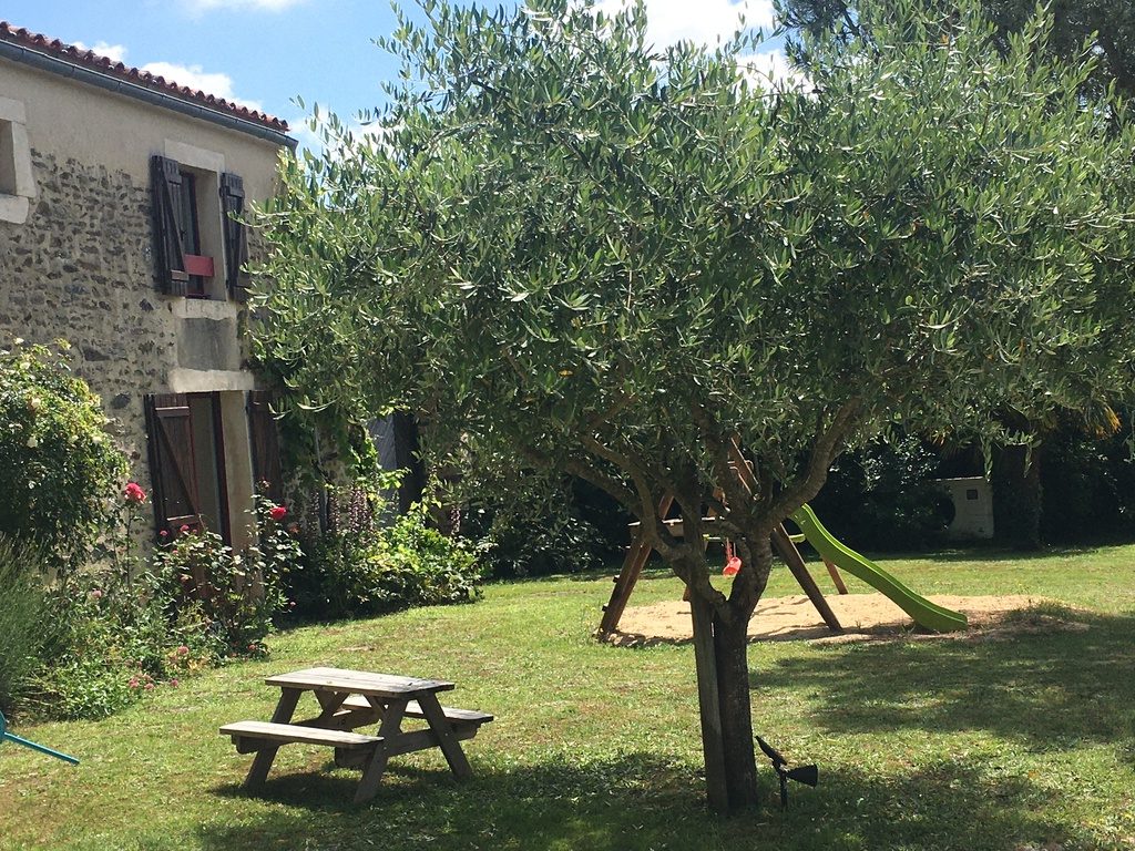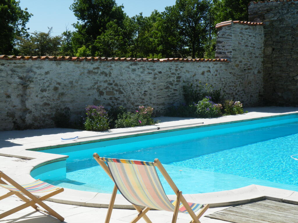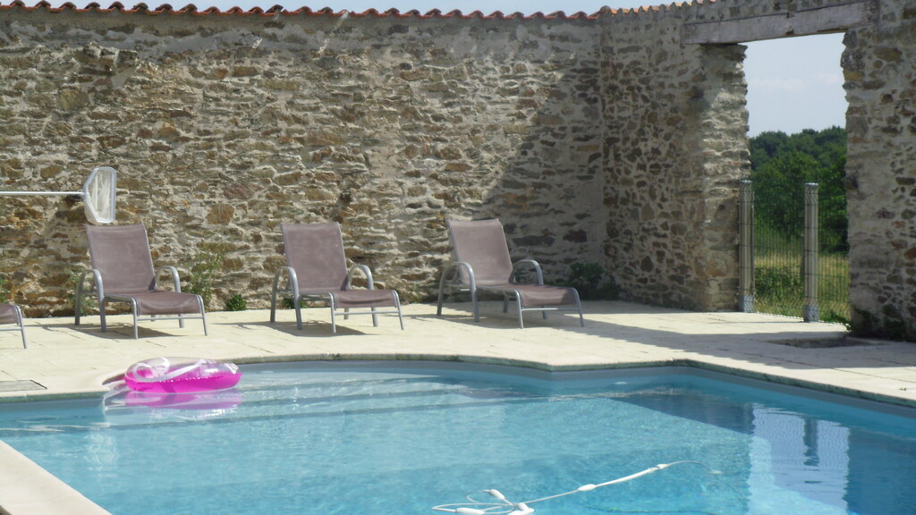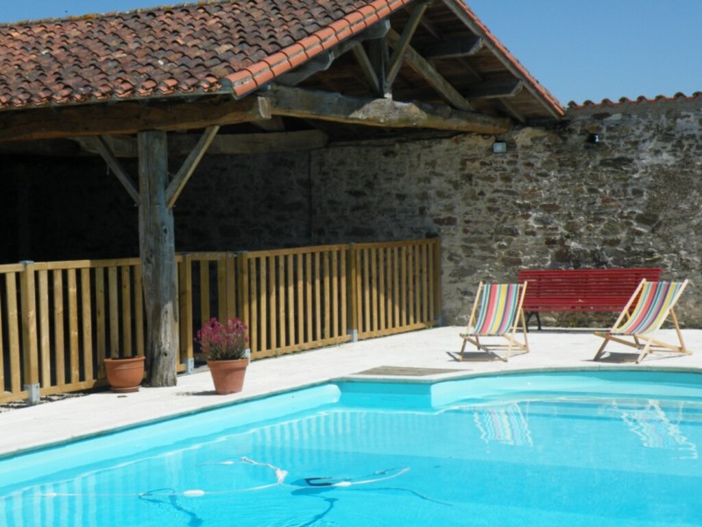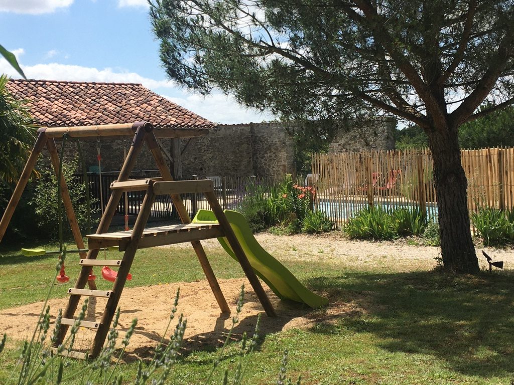 Préau de 60 m² sur caillebotis bois avec accès à la piscine privée chauffée du 1er juin au 30 septembre (10 m x 5 m), transat, table ping-pong, portique pour les enfants.