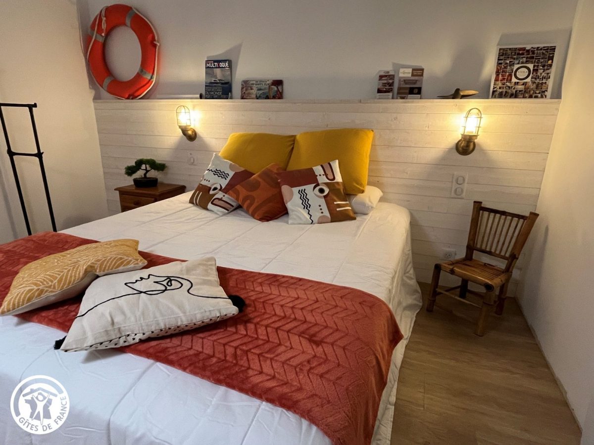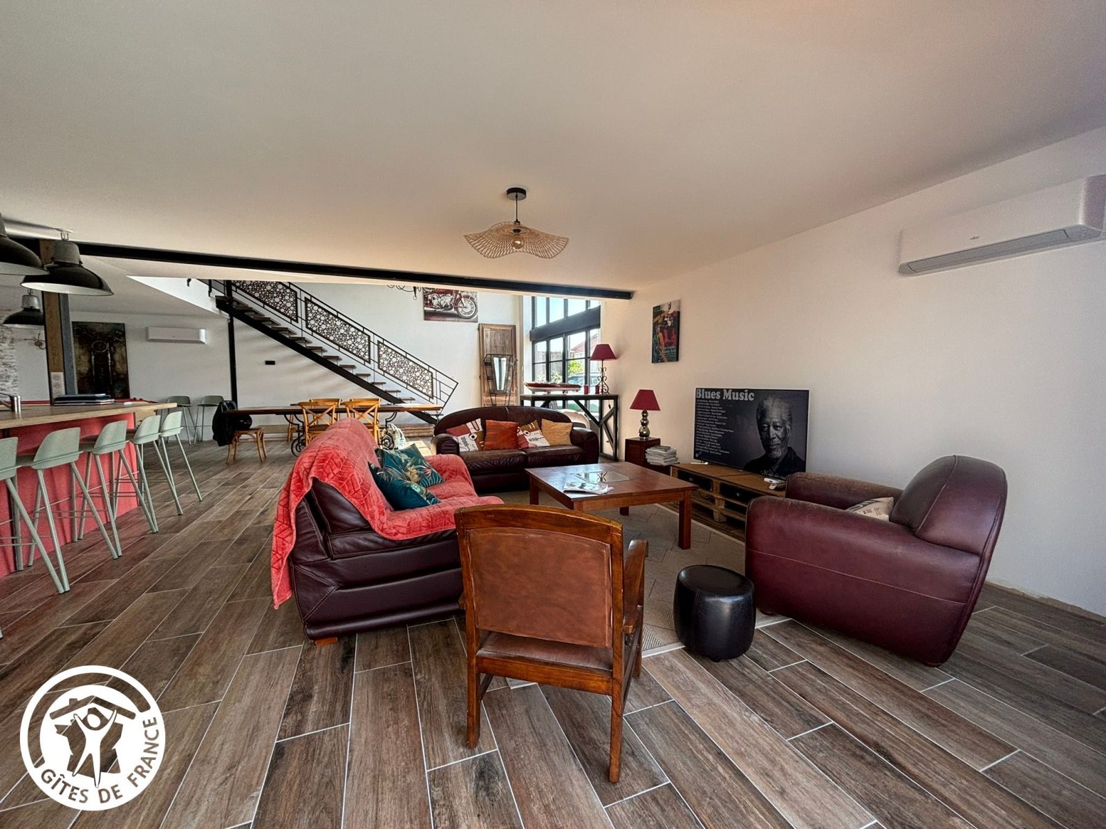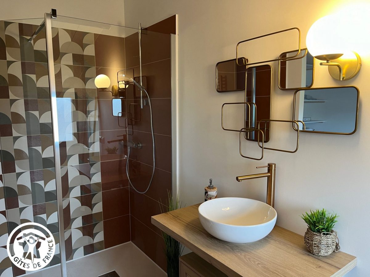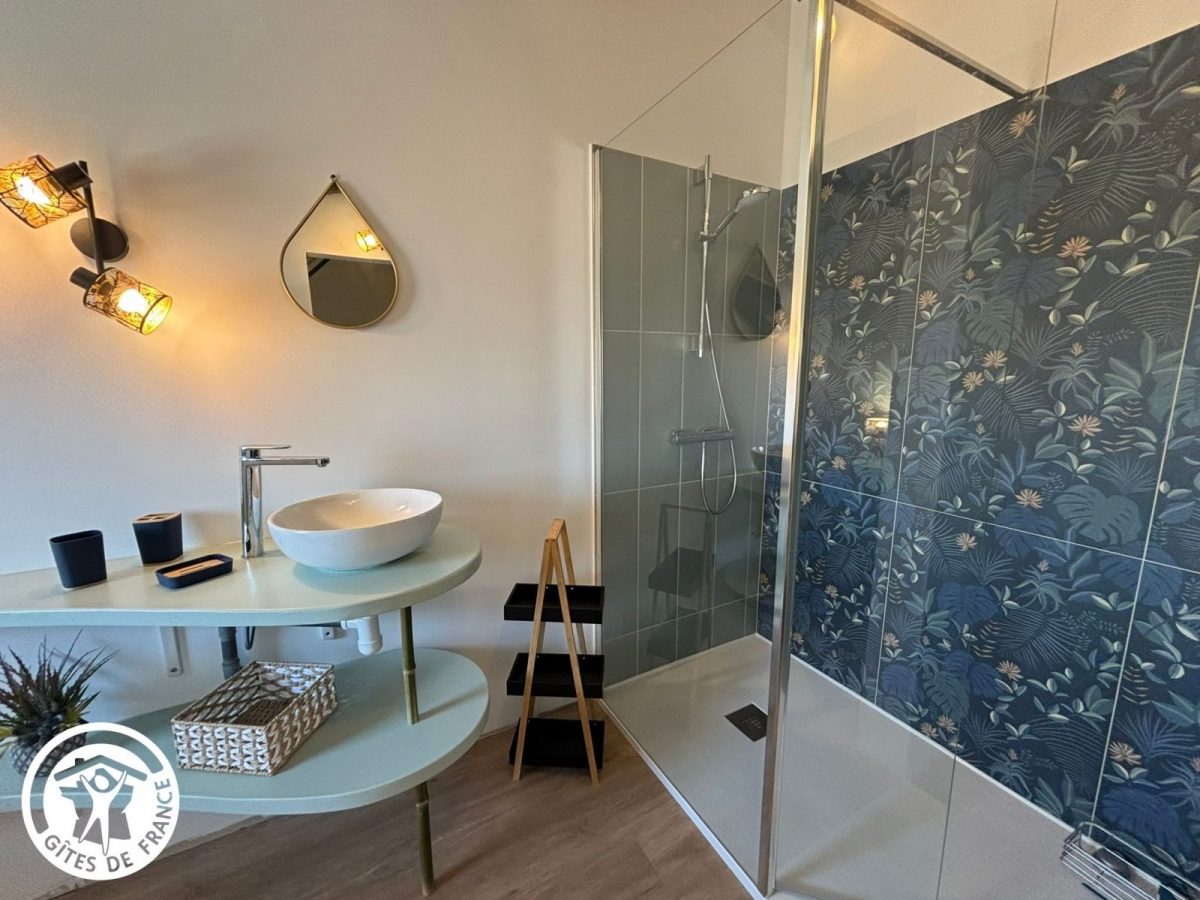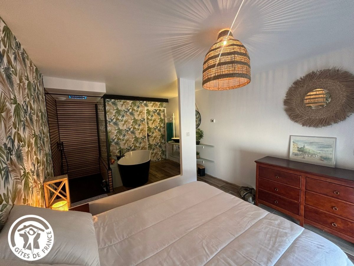 Le gîte se compose, au rez-de-chaussée, d'un vaste séjour/salon/cuisine, d'une chambre (1 lit 160) avec une salle de bain privative (douche avec luminothérapie et baignoire), d'un WC indépendant et d'une lingerie (lave-linge, frigo supplémentaire). A l'étage, une mezzanine avec un espace détente/lecture, 4 chambres (1 lit 160) (1 lit 160) (1 lit 160) (2 lits 80 jumelables) avec une salle d'eau/WC privatifs pour chaque chambre.