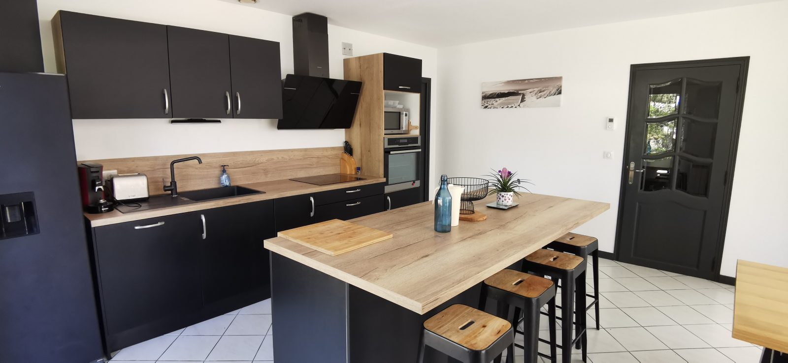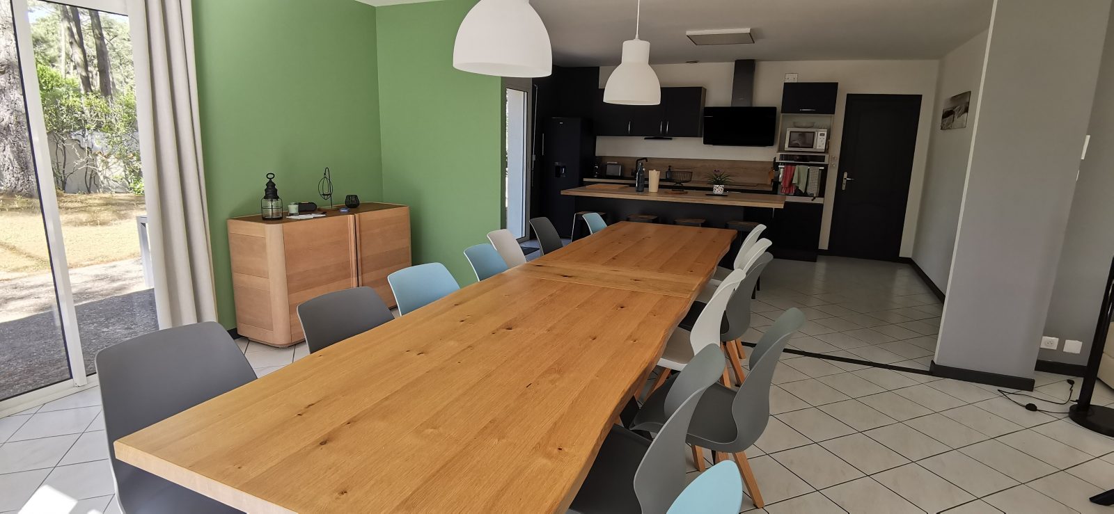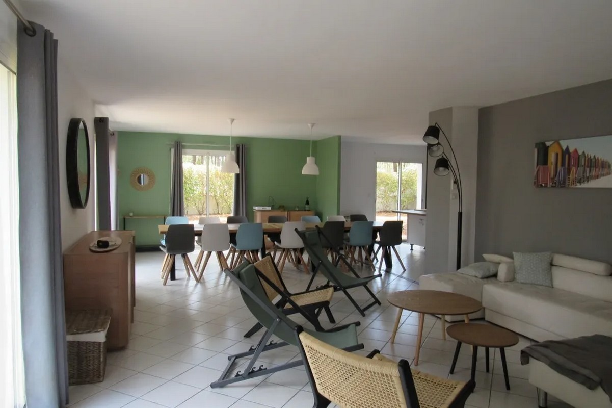 A l'ombre des pins dans cette villa spacieuse , elle peut recevoir jusqu'à 13 personnes. La maison dispose d'un grand salon/séjour avec une cuisine ouverte se prolongeant sur un 2ème séjour comprenant un canapé convertible, un baby foot , d'une suite parentale avec un lit en 160 et une salle d'eau et wc séparés, d'une chambre avec un lit en 160, d'une chambre avec deux lits superposés (140 en bas et 90 en haut), d'une salle de bain et d'un wc séparé.