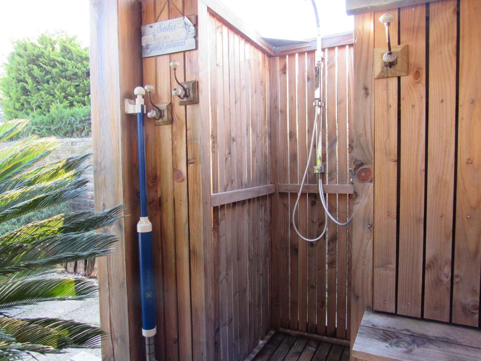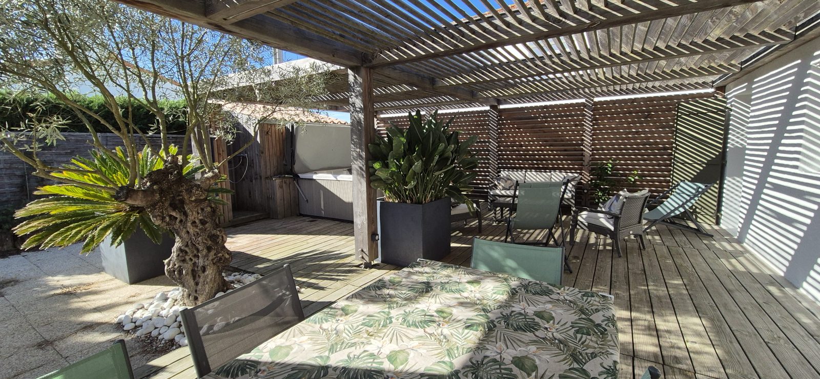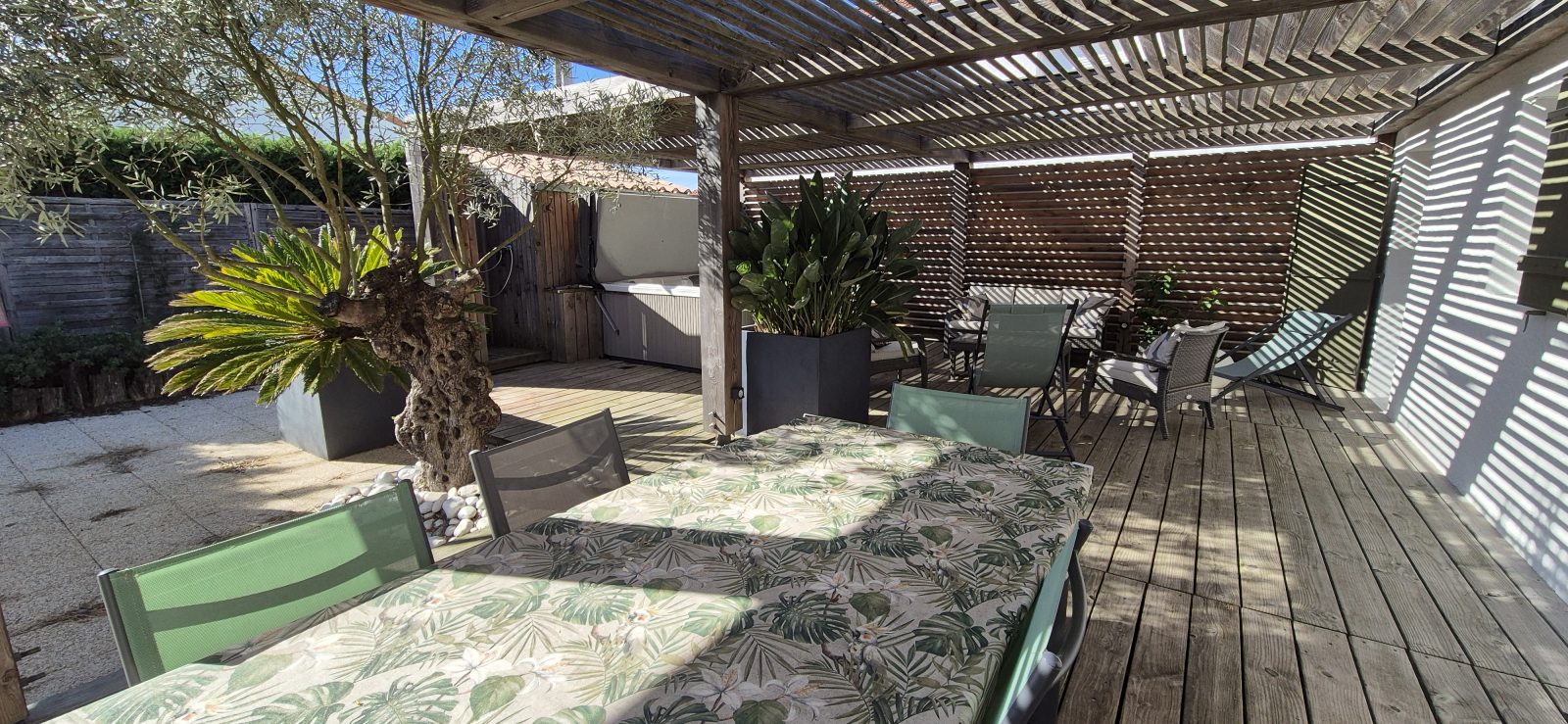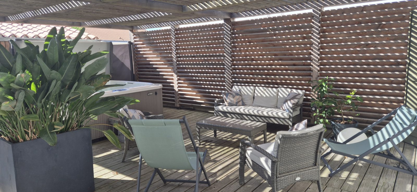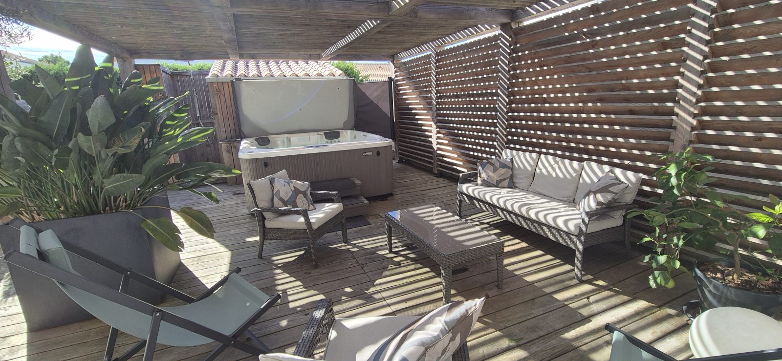 Vous profiterez de la terrasse en bois de 75 m² environ disposant d'un spa, d'une douche extérieure et d'un salon de jardin..