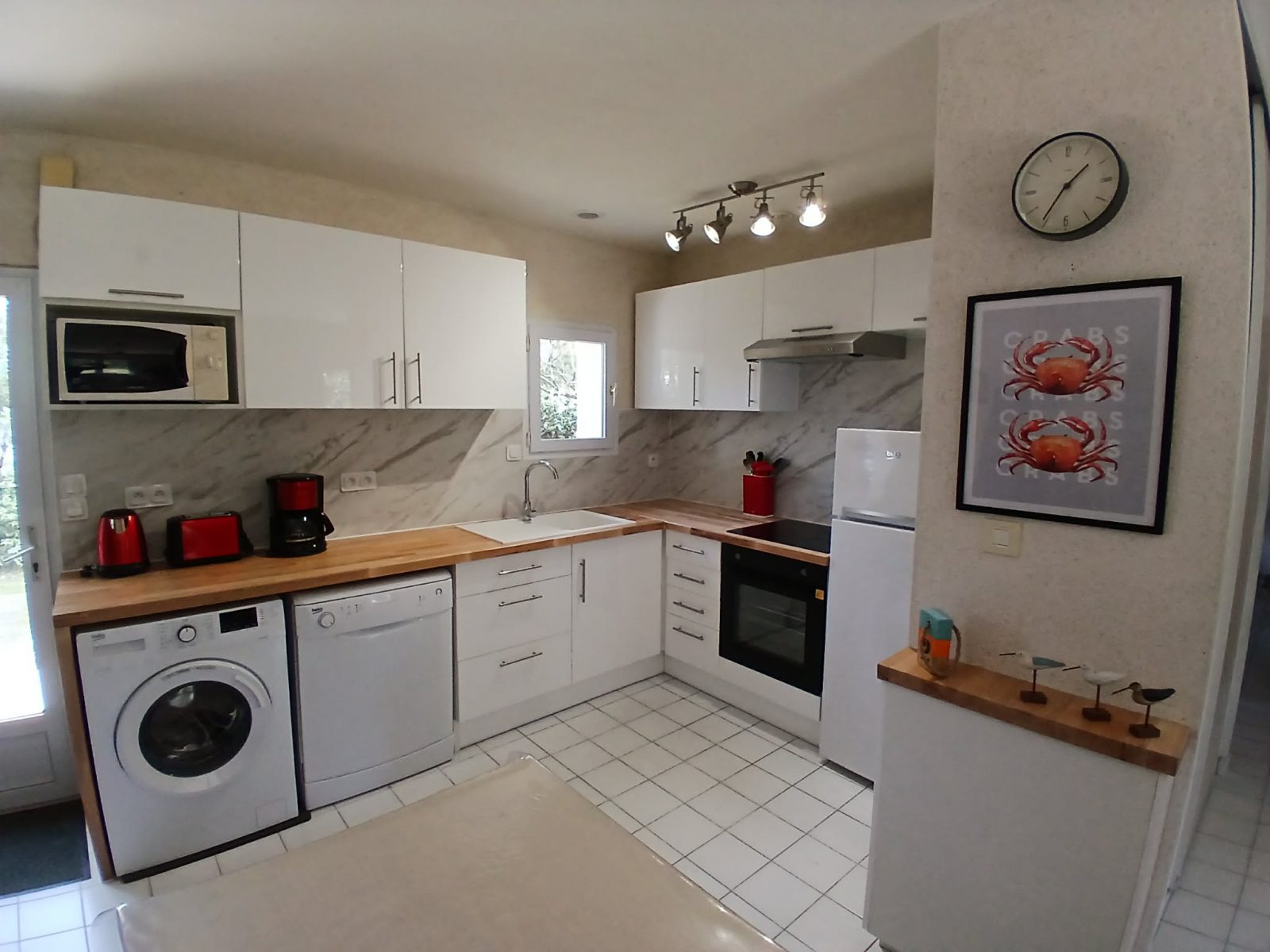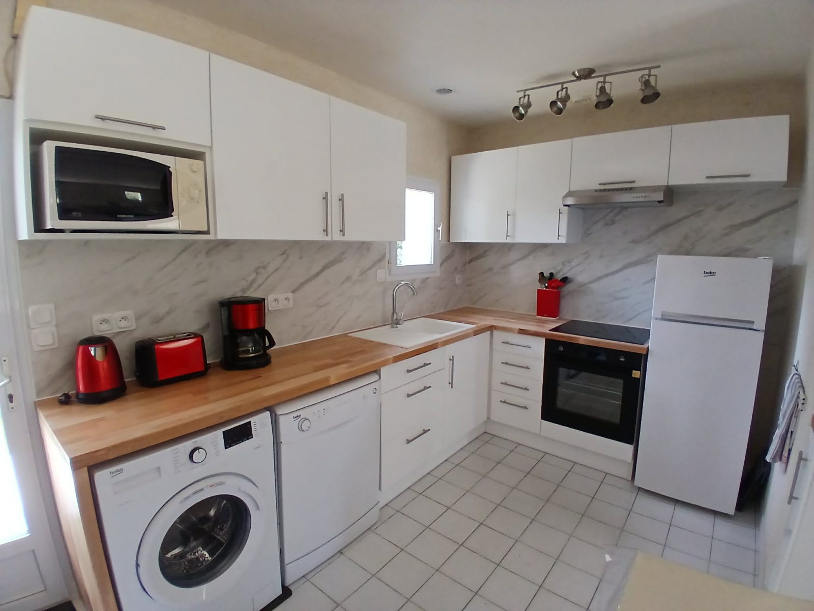 Cuisine équipée et aménagée (four, plaque cuisson, hotte, lave-vaisselle, lave-linge, réfrigérateur)