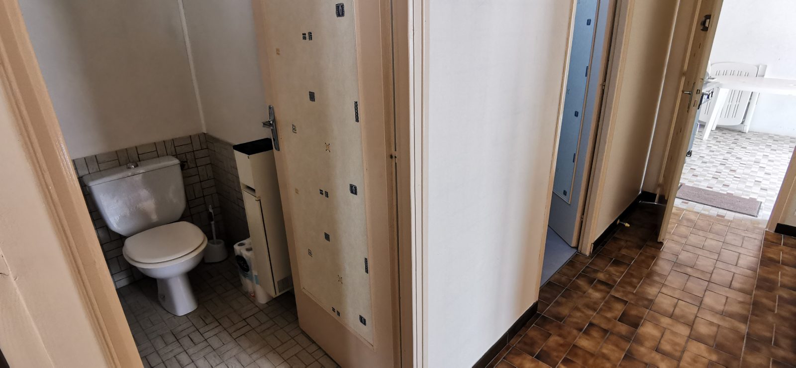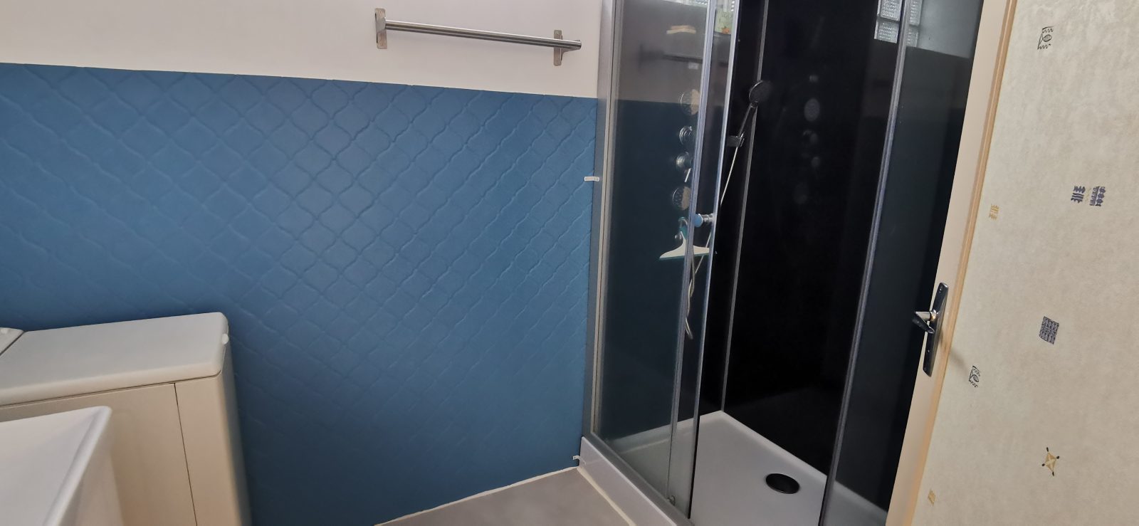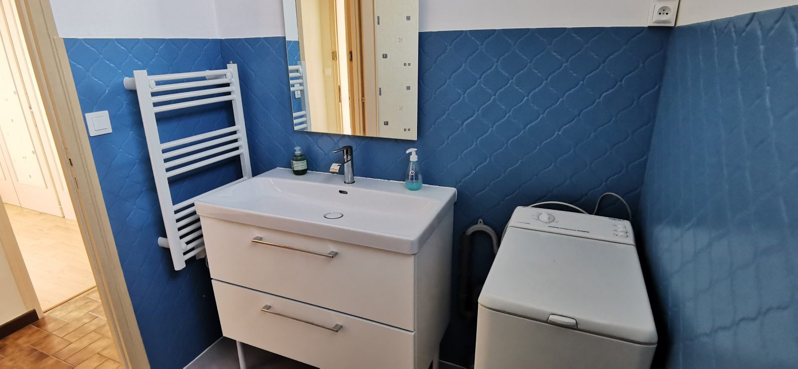 Une Salle d'eau avec cabine de douche, lavabo et machine à laver. WC séparé.
