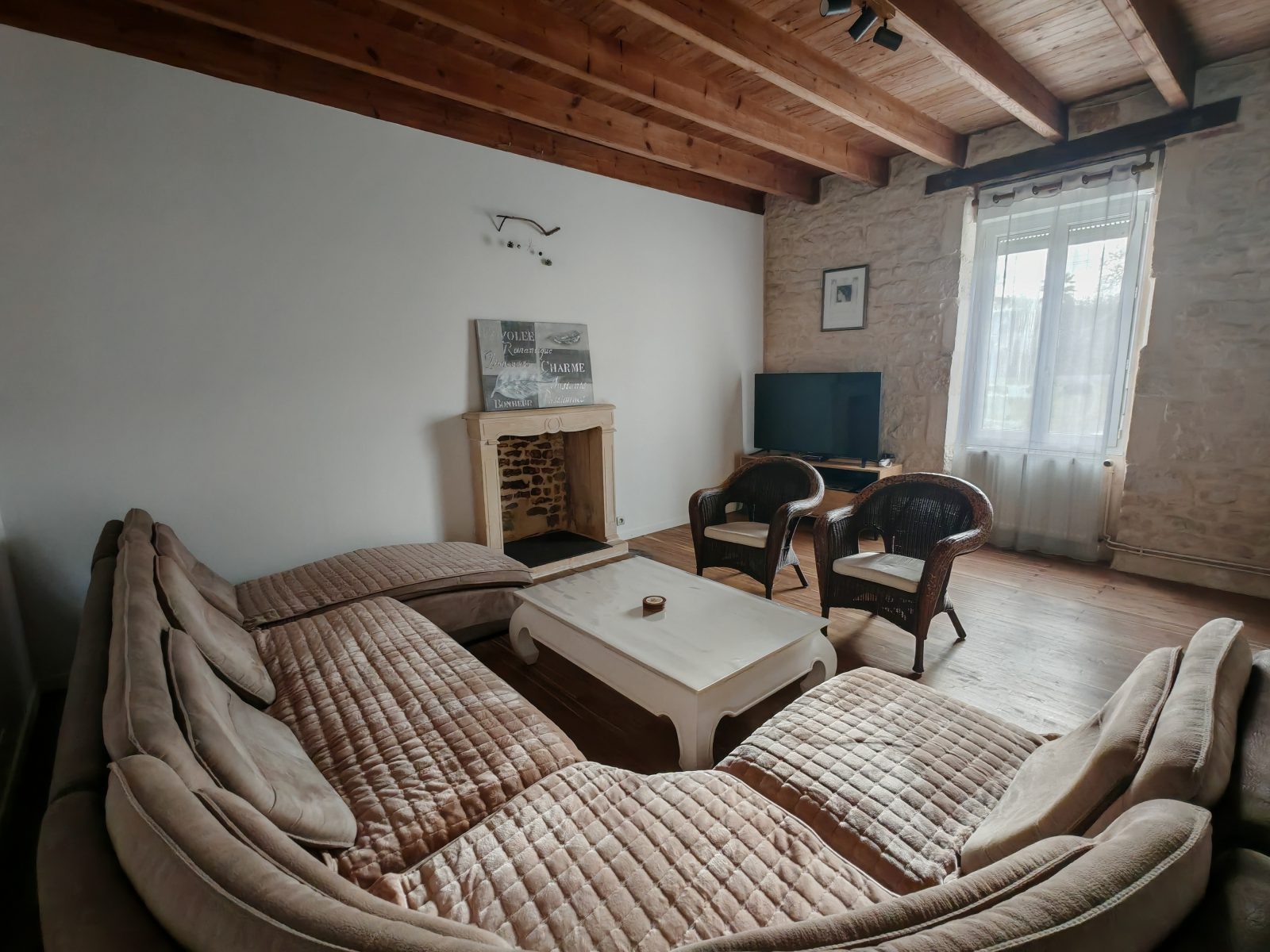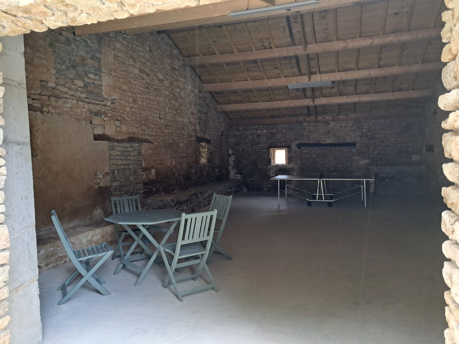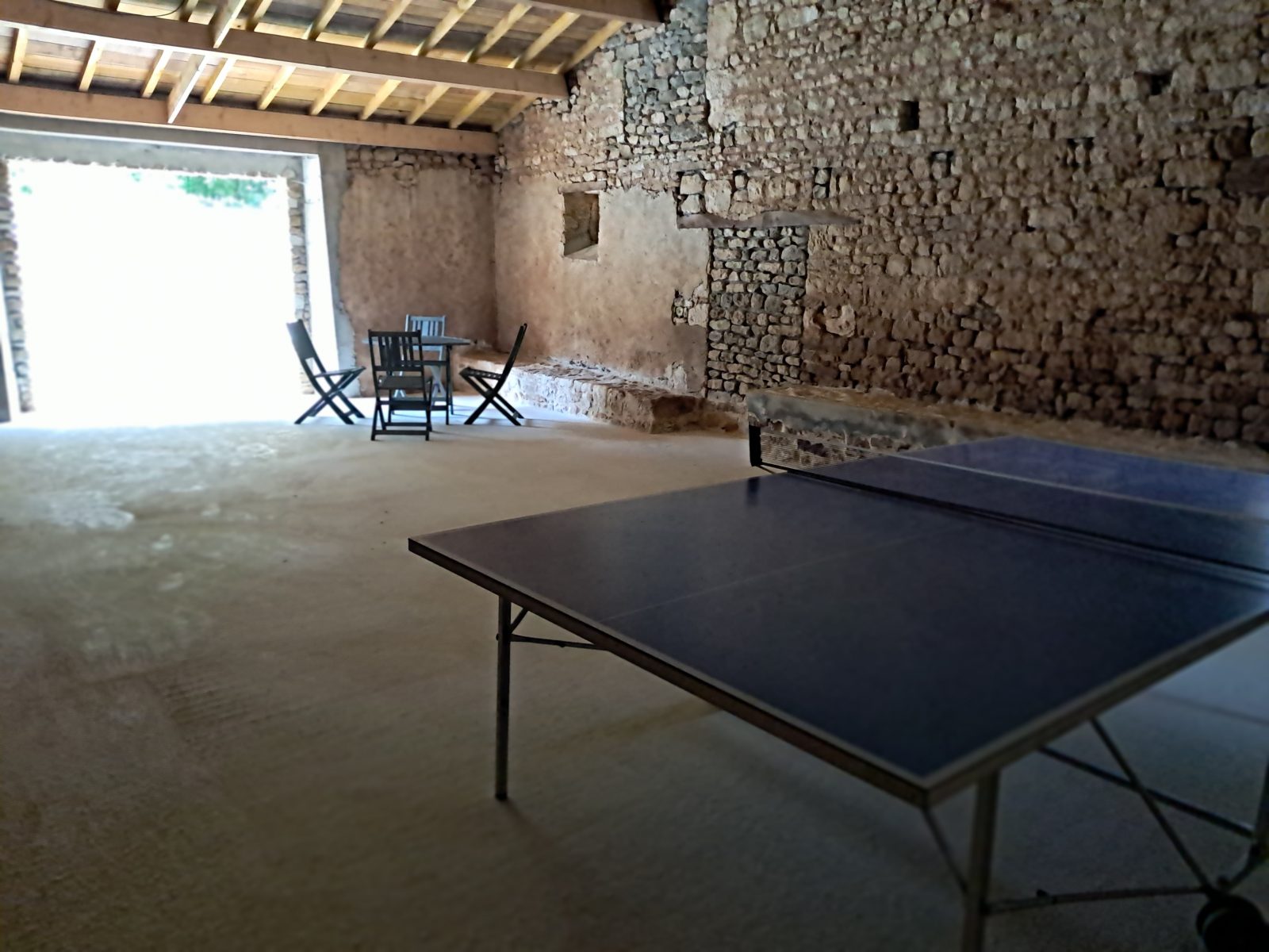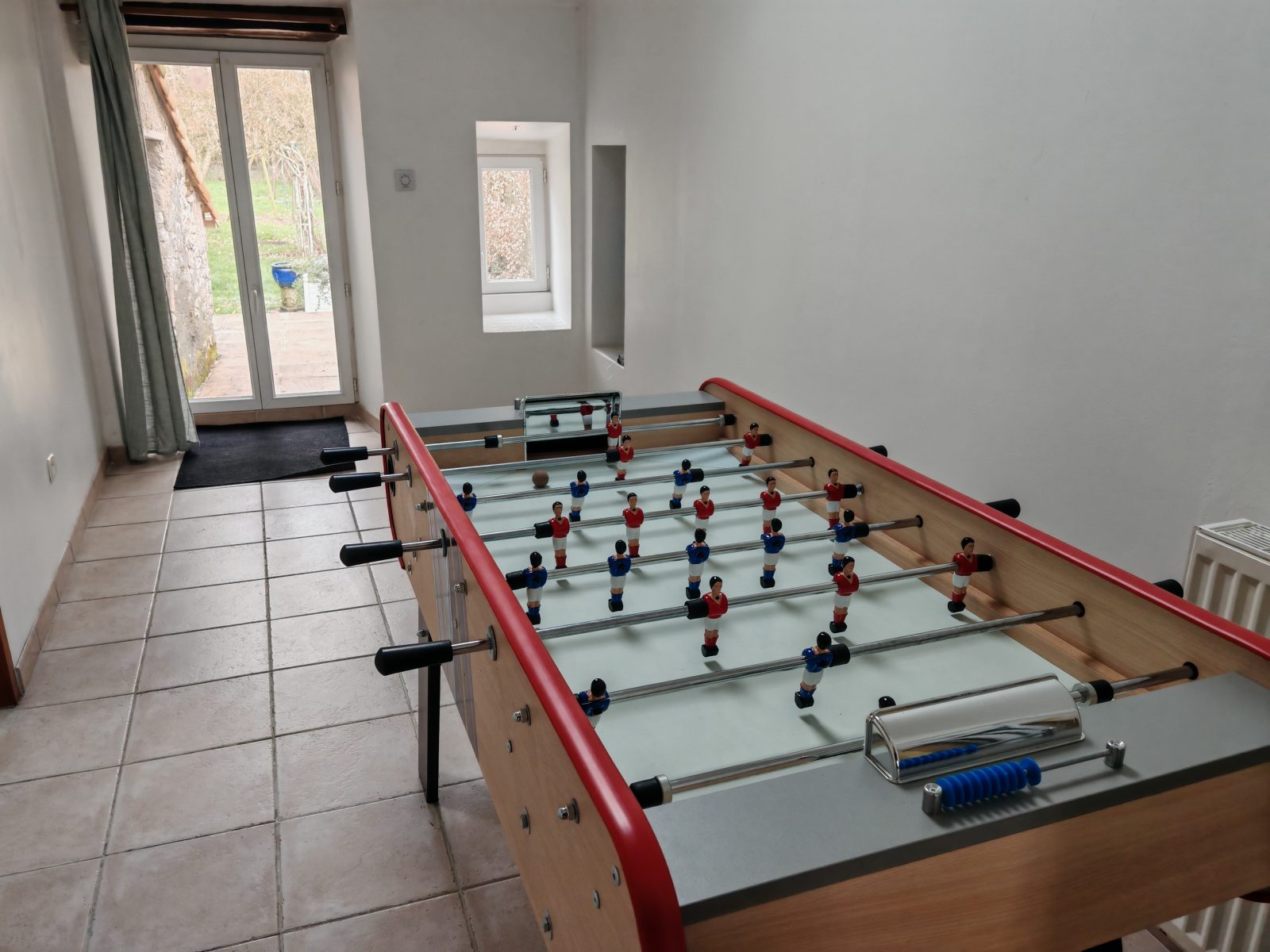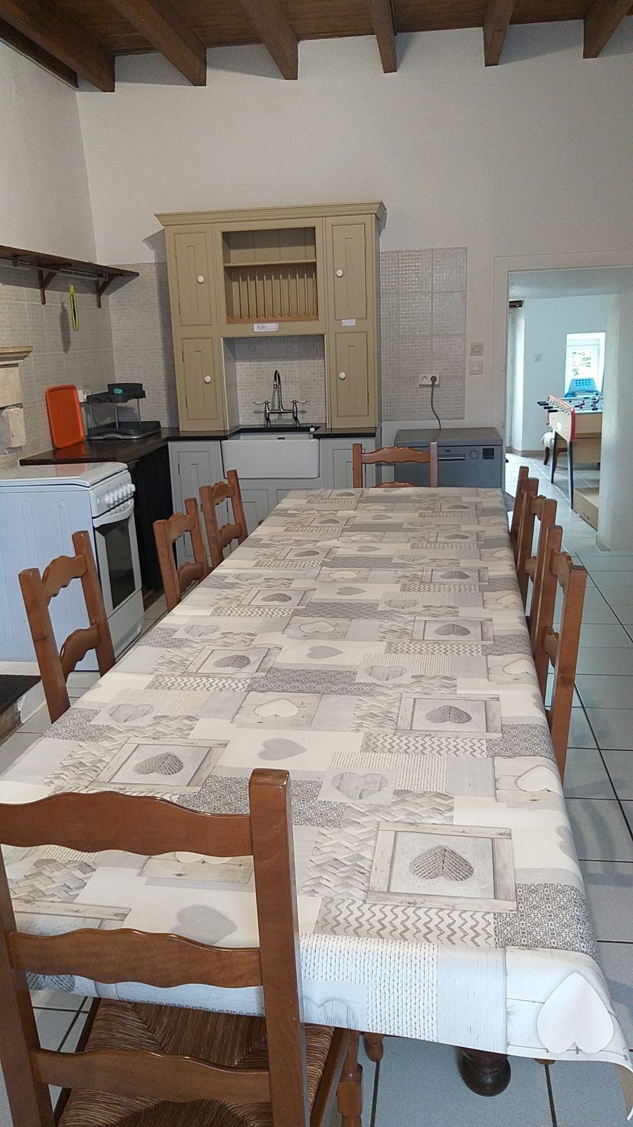 La maison se compose au rez-de-chaussée d'une grande cuisine avec son coin repas, un salon, un boudoir avec un baby-foot et une salle d’eau avec wc.