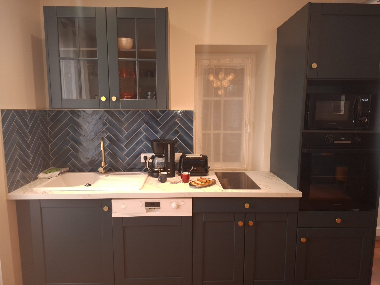 Au rdc, une pièce de vie avec un canapé-lit confort et d'une cuisine équipée.