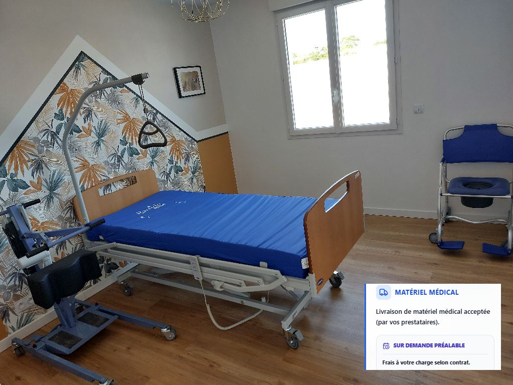 - Deux lits de 90x200 cm, modulables (séparés ou collés en un lit de 180x200 cm). Nous acceptons également les lits médicalisés, en s’organisant en amont ensemble.