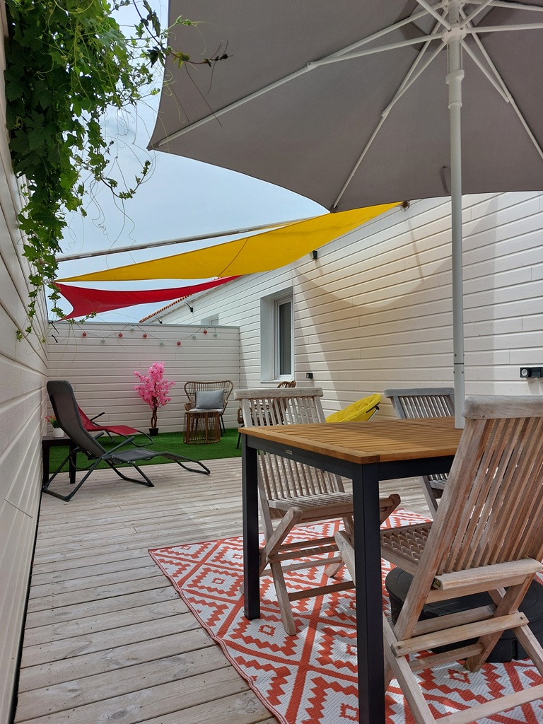 - Salon de jardin, table, chaises, parasol et transats pour profiter du beau temps.