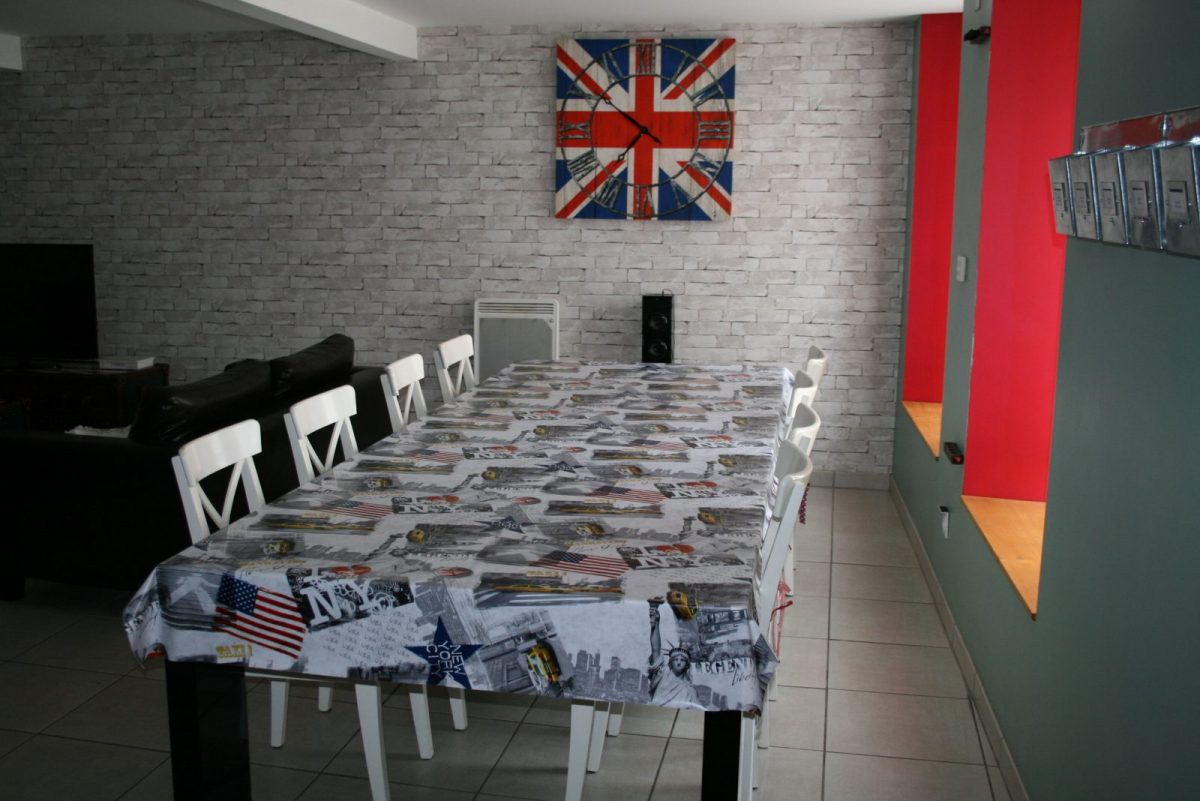 La maison dispose d'un espace entrée, d'un grand salon, d'un espace salle à manger avec une table pouvant accueillir de 12 convives, d'une grande cuisine, d'un WC au RDC.