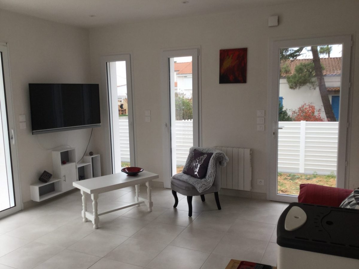 Maison neuve de 2017 située à 400 m de l'accès plage et du marché (jeudi et dimanche), 500 m du port et du golf 9 trous, 600 m du centre bourg et la rue piétonne. Elle se compose : au rez-de-chaussée d'une pièce de vie avec cuisine ouverte et équipée sur un séjour de 36 m², 2 chambres avec lits de 140x190, 1 SE avec douche italienne, 1 WC séparé, 1 buanderie, 1 garage de 20 m², 1 terrasse EST et SUD de 60 m².