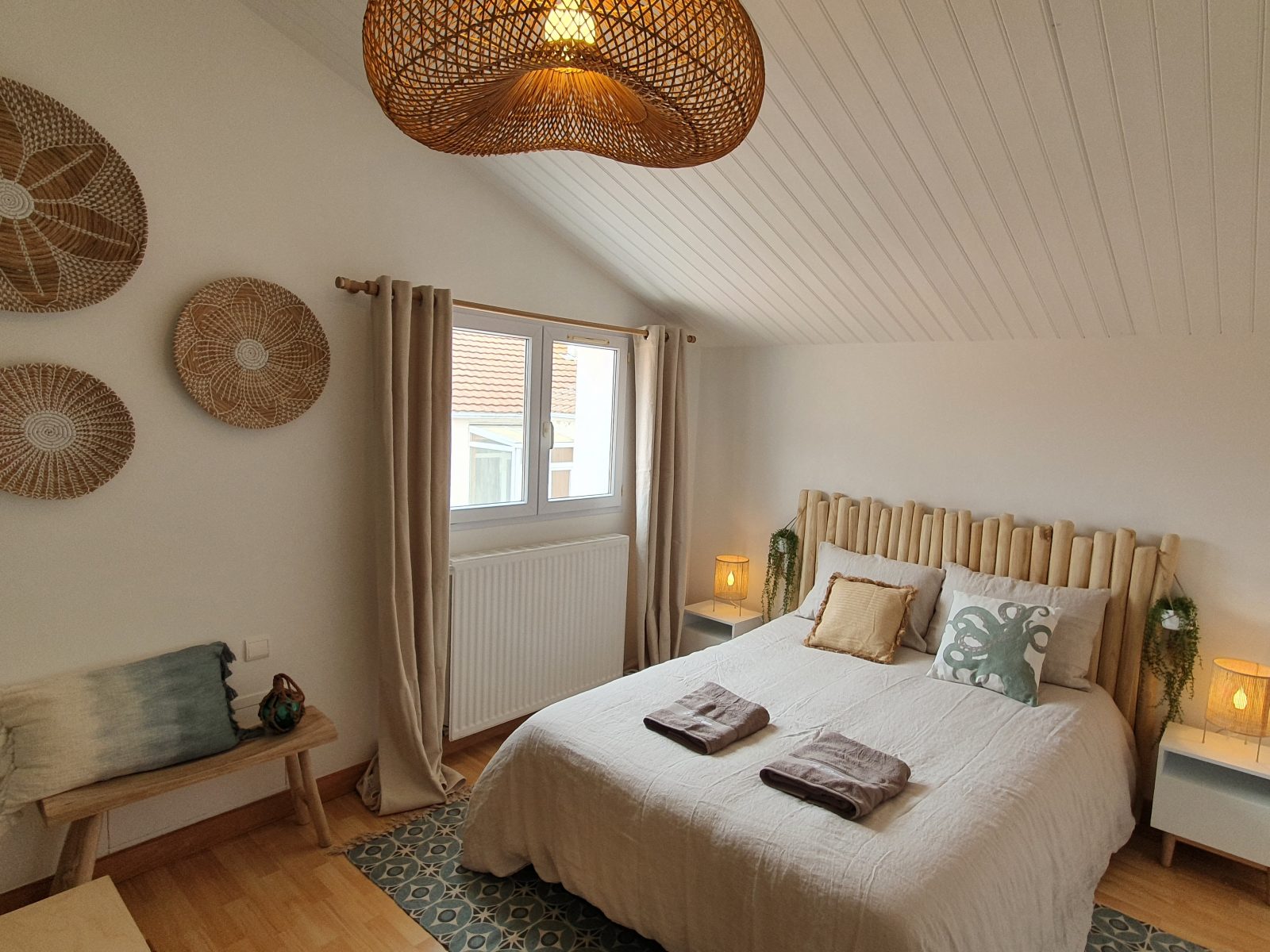 Une chambre avec un lit de 140 + un lit de 90 superposé + 2 autres lits de 90 superposés. Idéal pour enfants et ados. 5 couchages dans cette chambre.