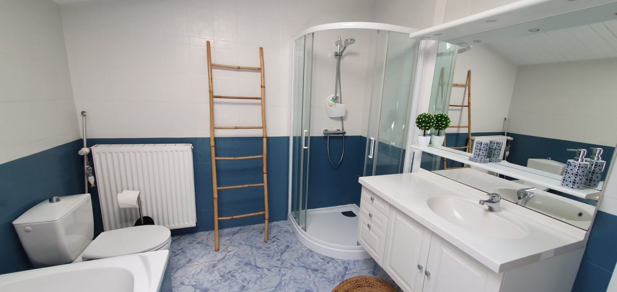 Une salle d'eau rdc avec lavabo, toilettes, douche (pratique pour se laver au retour de la plage), lave linge et sèche-linge.