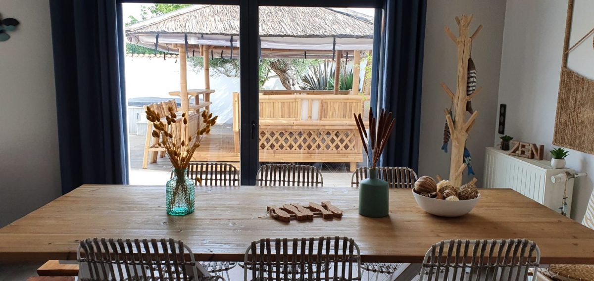 La terrasse est équipée d'une exceptionnelle paillote fabriquée aux philippines, pour 10/12 personnes avec bar, éclairage et chauffage + 2 transats en bambou.