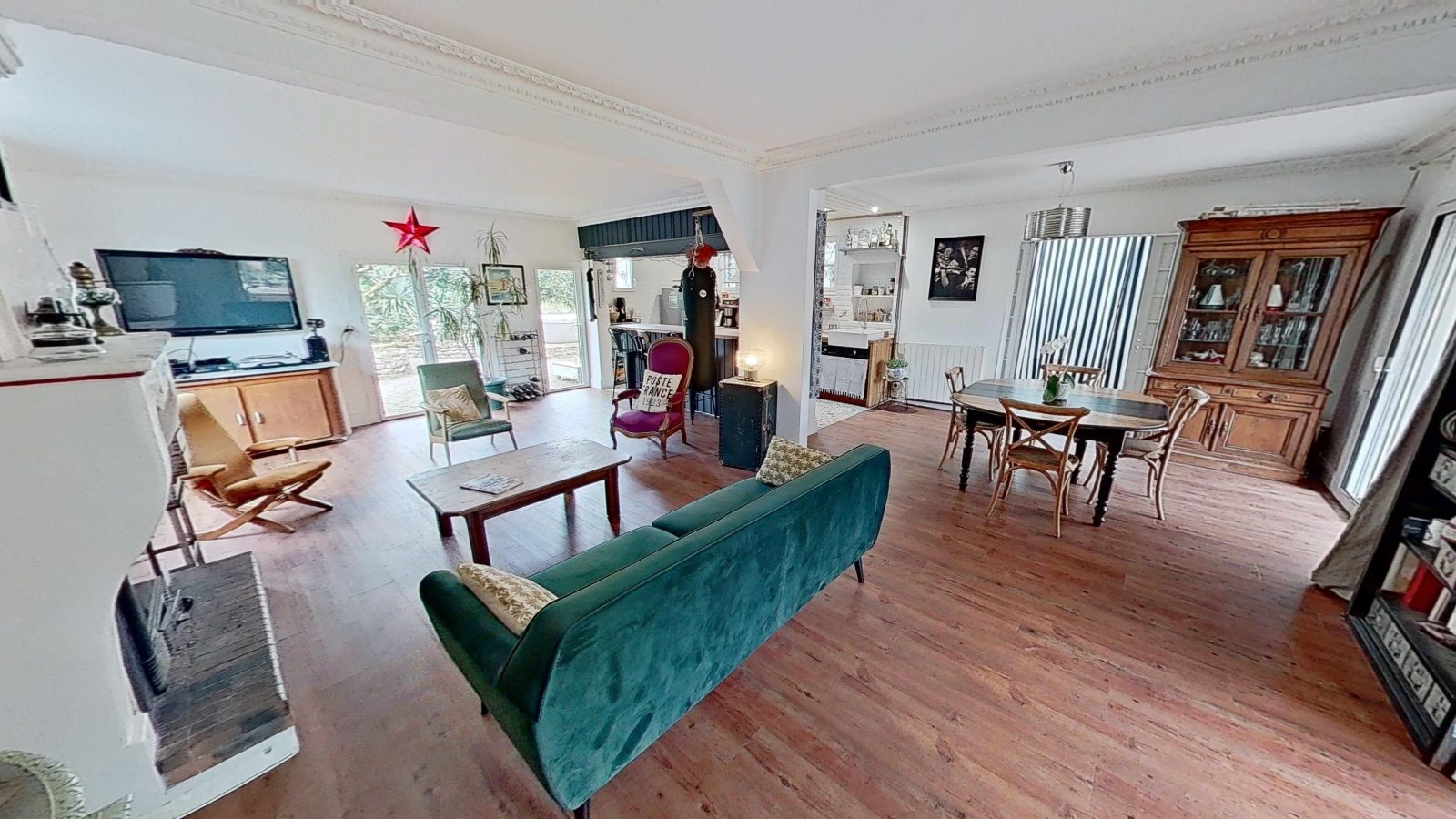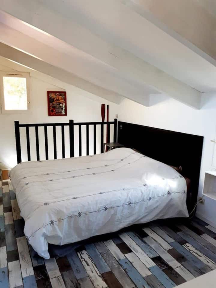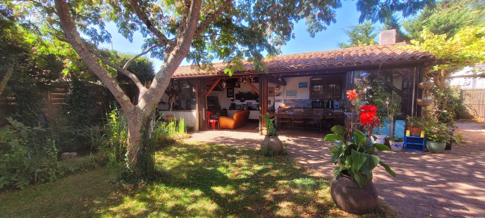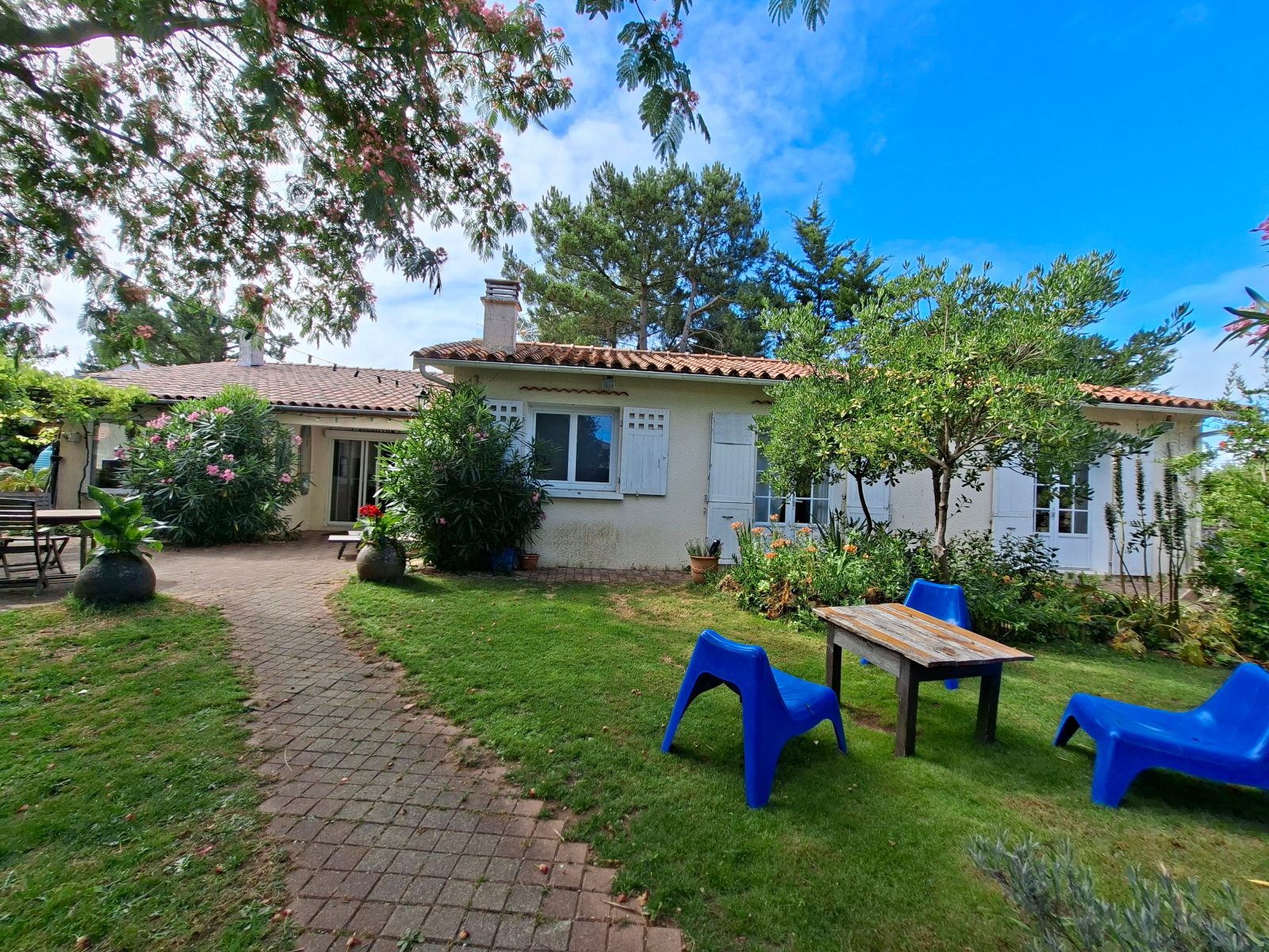A l'extérieur, vous profiterez d'un terrain clos arboré, terrasses, salons de jardin, transats, plancha, d'un préau fermé avec cuisine d'été (barbecue bois) et d'un spa gonflable électrique 6 places. Un abri pour motos et/ou vélos est à votre disposition.