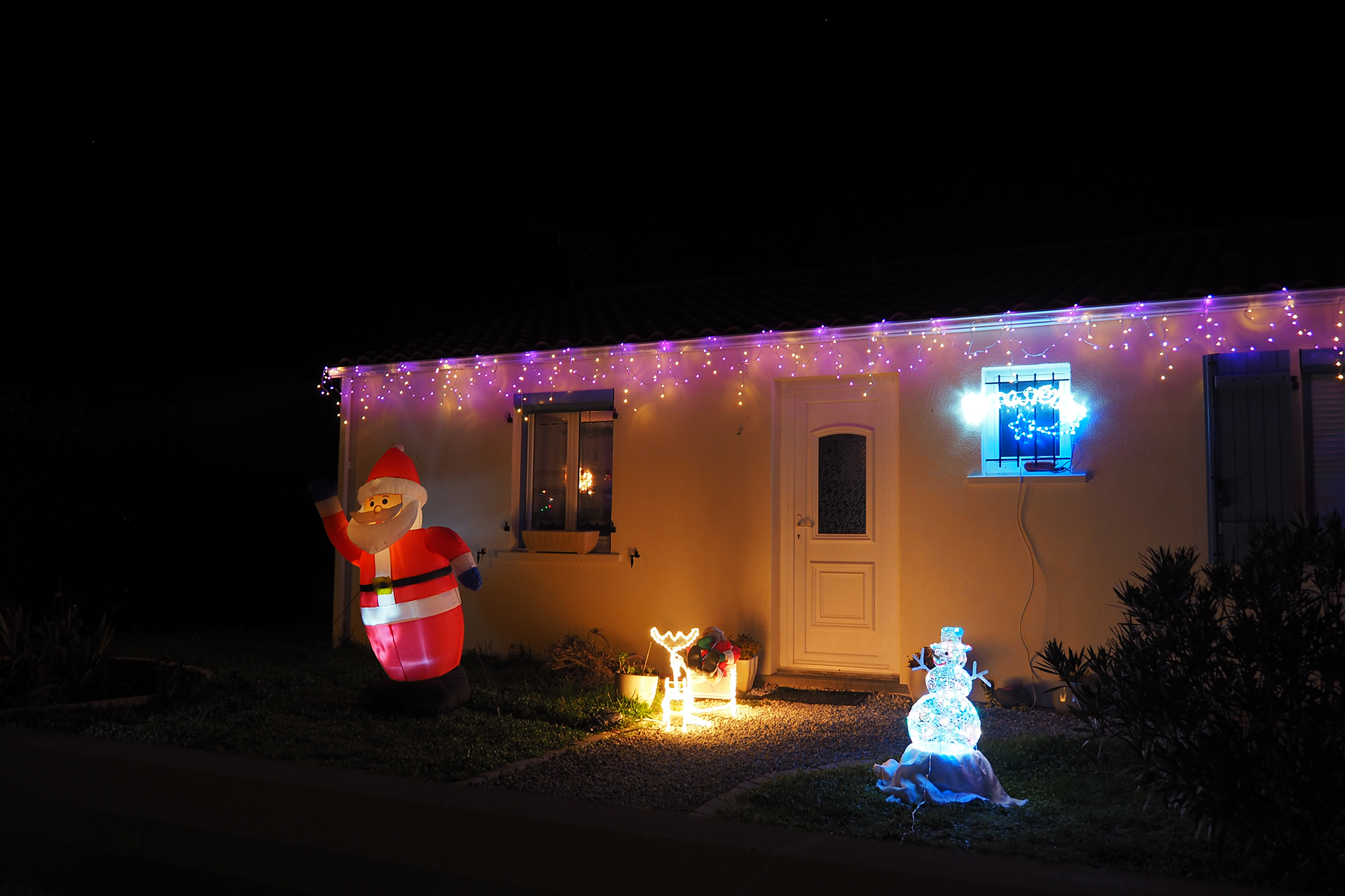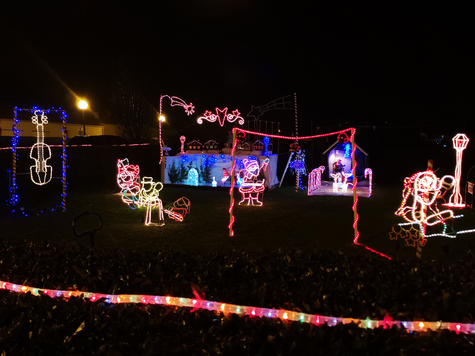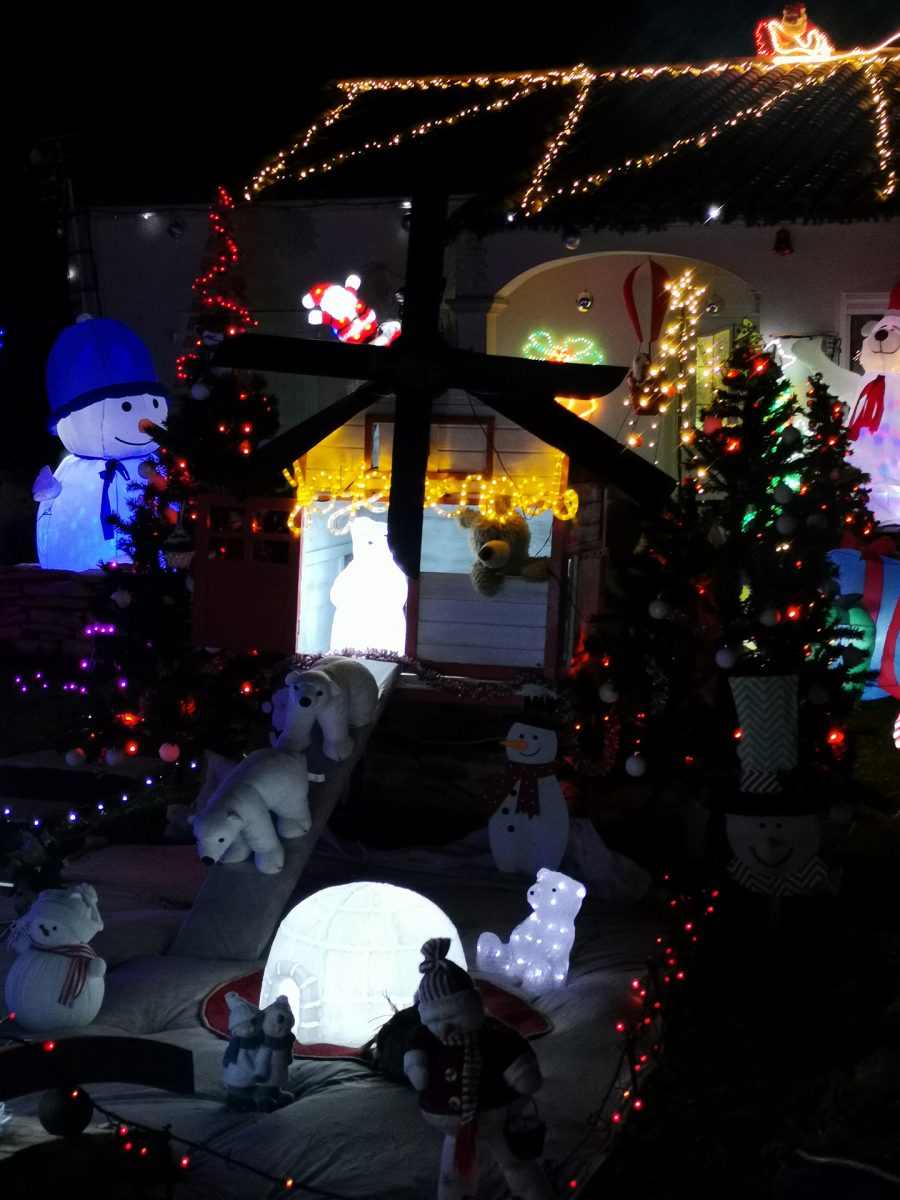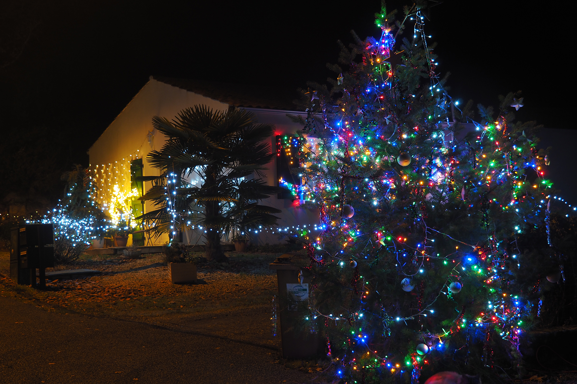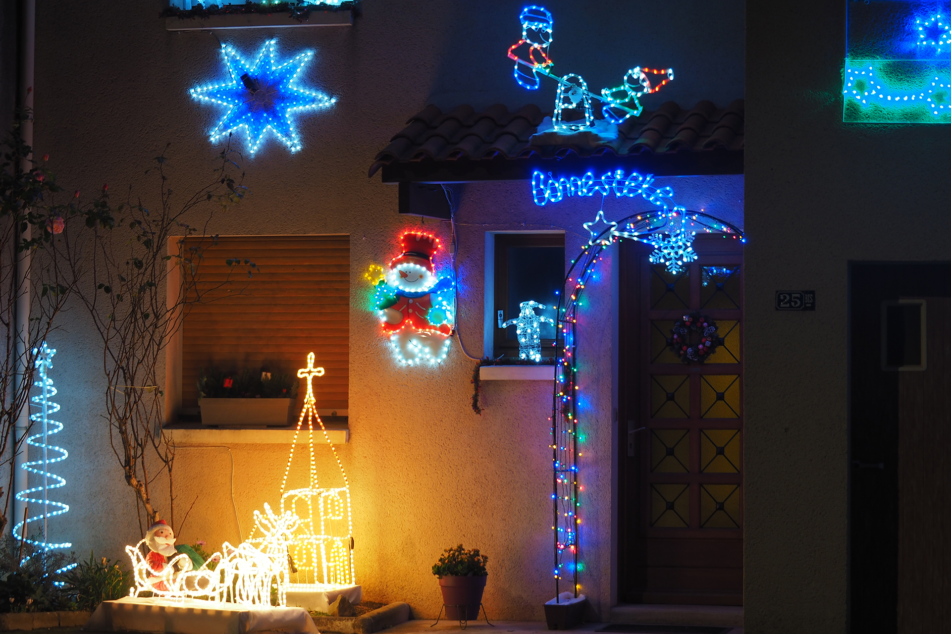 Parfois, des rues entières ou des lotissements entiers jouent le jeu et les façades des maisons se parent de guirlandes multicolores ou de projections animées. Cela apporte un rayon de soleil dans la nuit.