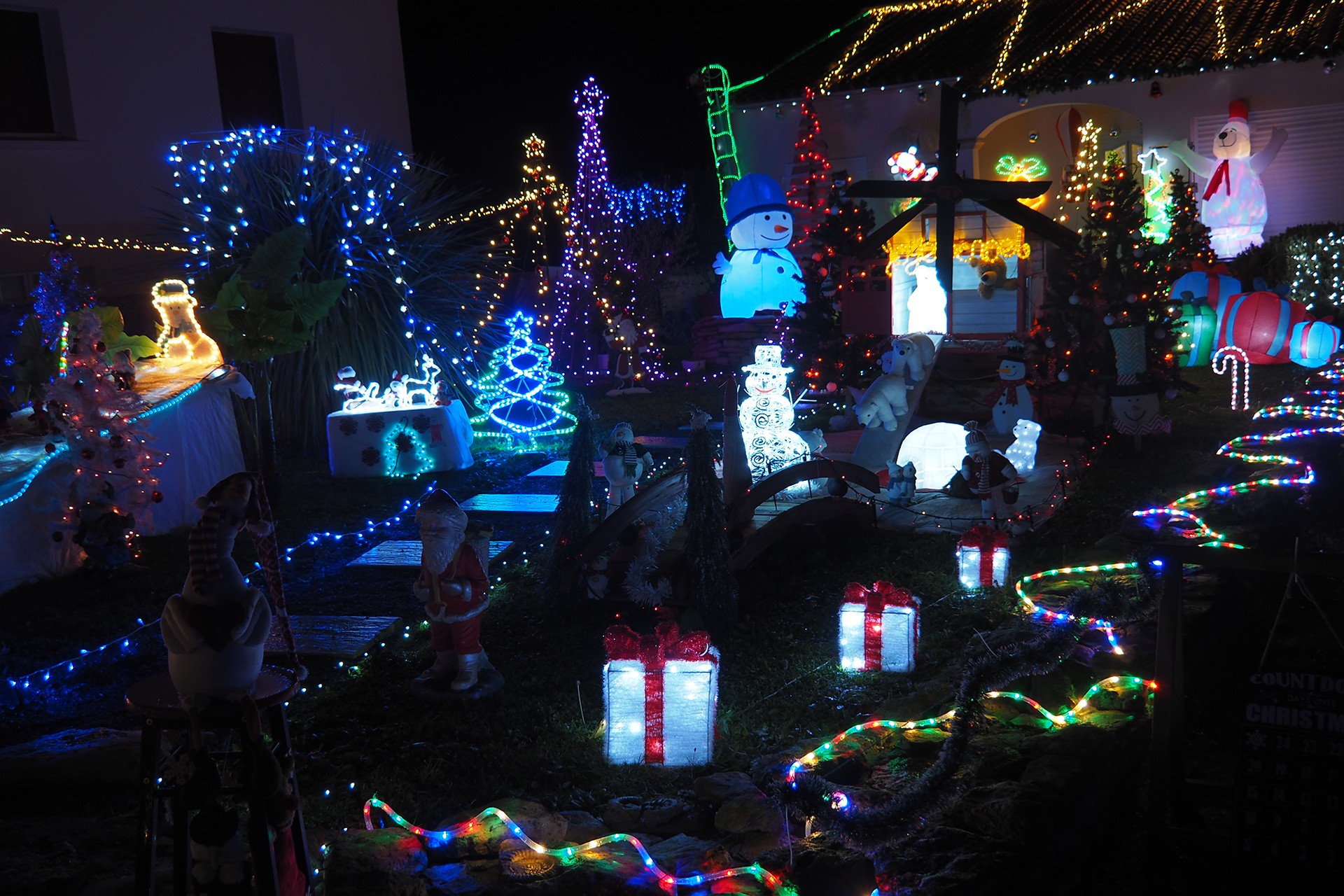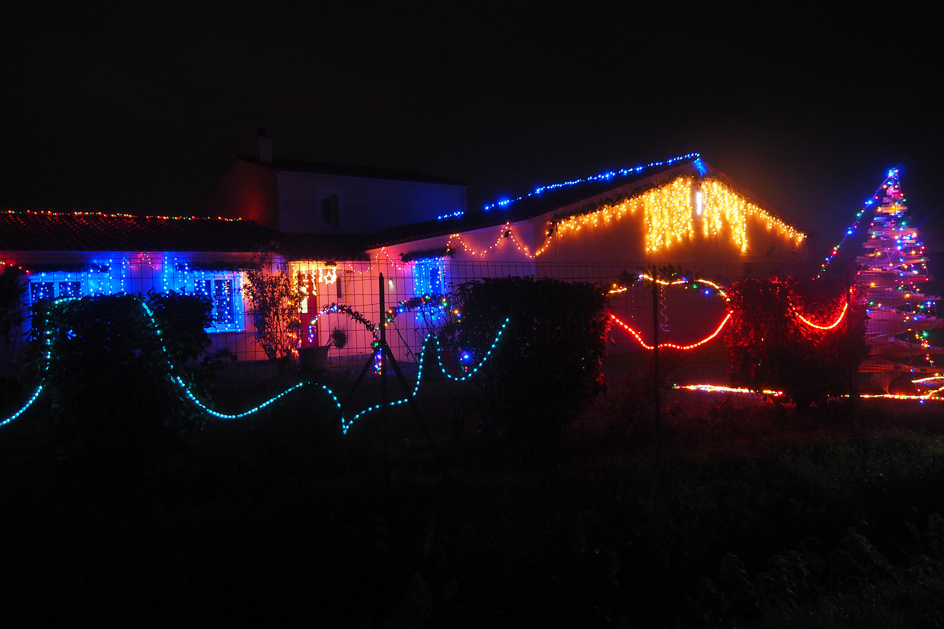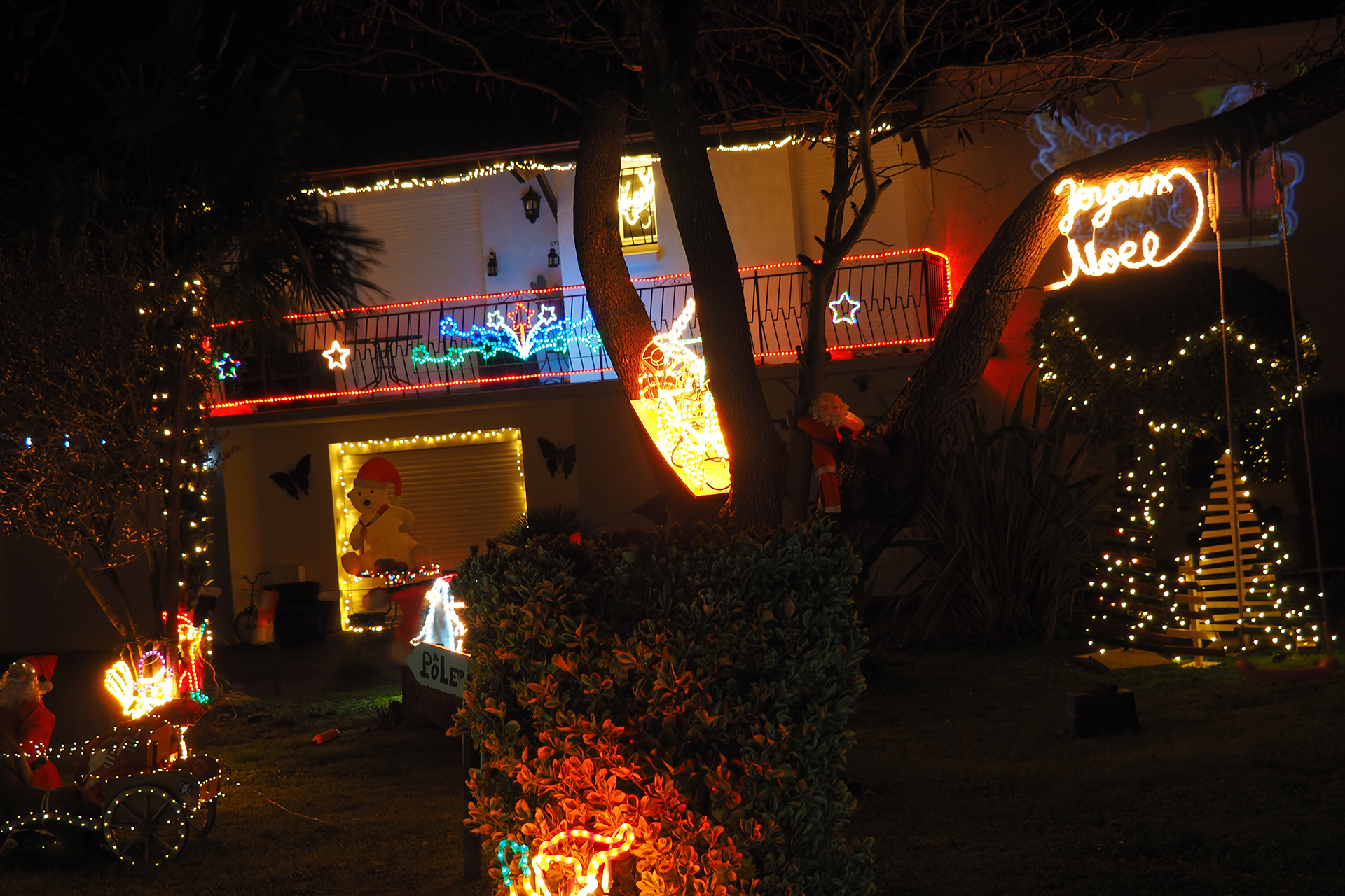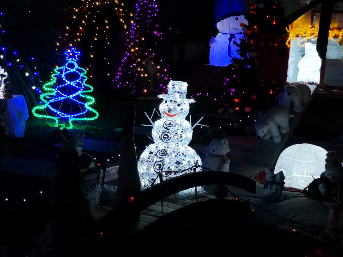 Parfois, des rues entières ou des lotissements entiers jouent le jeu et les façades des maisons se parent de guirlandes multicolores ou de projections animées. Cela apporte un rayon de soleil dans la nuit.