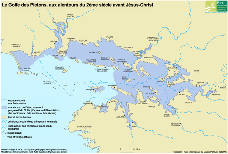 Premier choc : le golfe des Pictons ! Quand on voit cette carte, on se rend compte que le Marais poitevin, il y a 6 500 ans, n’était qu’une vaste cuvette remplie d’eau, l’eau de l’océan. Seules dépassaient quelques îles. C’est sur ces anciennes îles que les hommes se sont installés en priorité au fil des siècles, pour être sûrs d’avoir les pieds au sec (pas bête, hein !). Le village de Chaillé-les-Marais est par exemple une ancienne île.