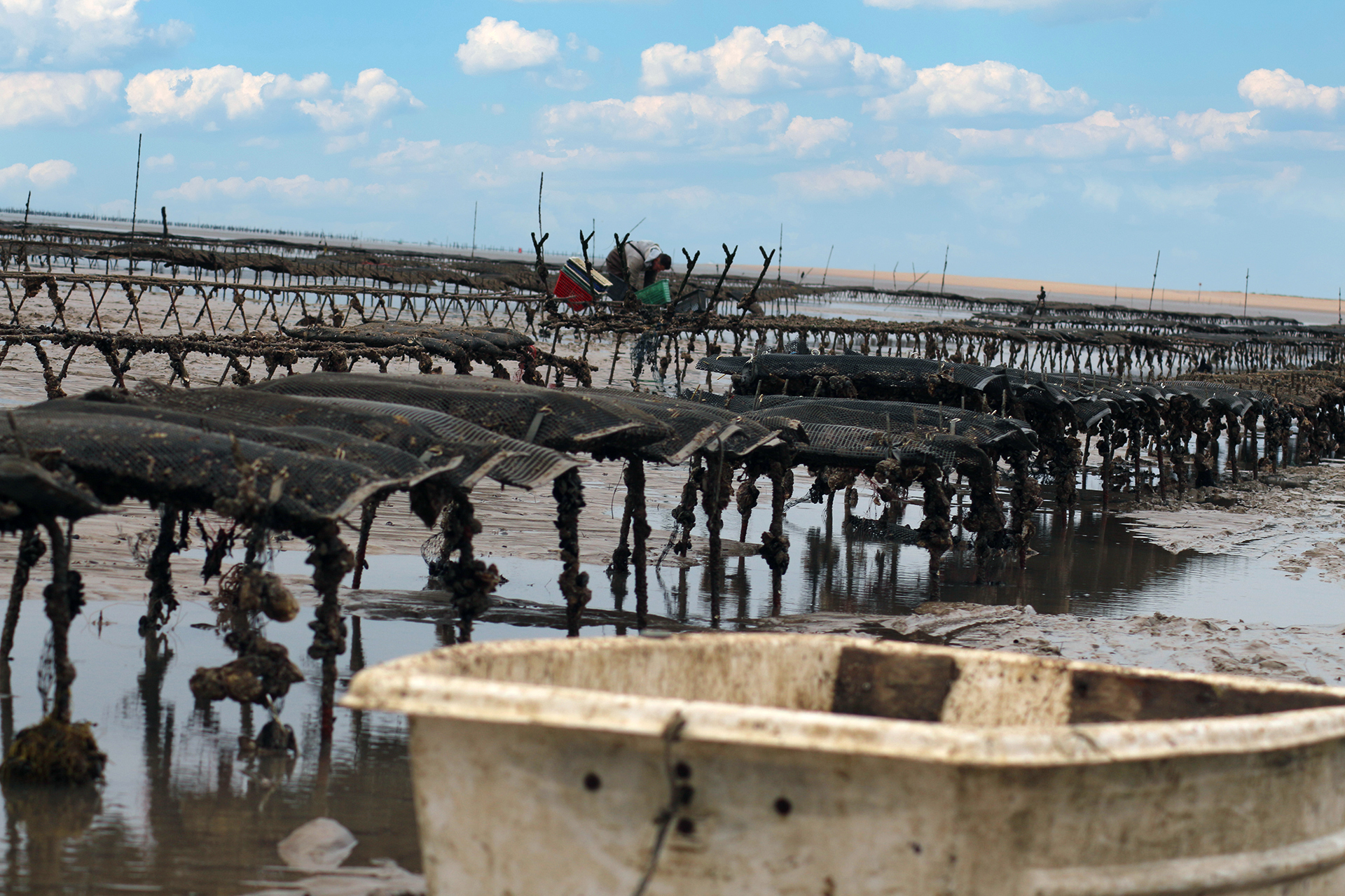 Les plus curieux auront remarqué à la Pointe, à marée basse, les tables sur lesquelles sont posées les sacs contenant les huîtres. Elles grossissent tranquillement au gré des marées et du brassage des ostréiculteurs. Elles sont bichonnées avant de les retrouver sur les étals. Greg ou Guillaume sont intarissables à leurs sujets. Et qui sait, peut-être trouverez-vous une perle ?…