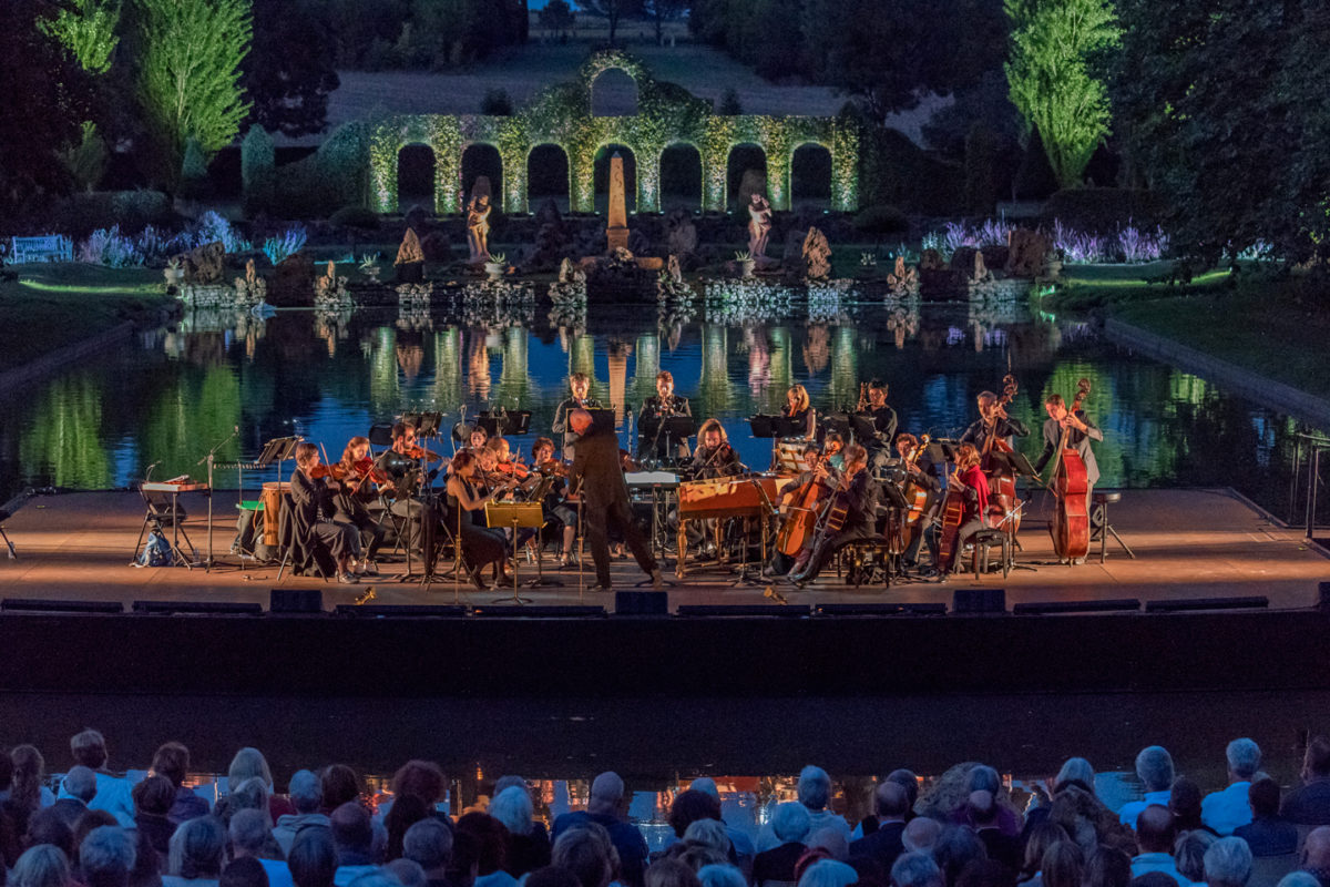 Alors que les derniers rayons de la journée tentent de miroiter sur le grand bassin transformé en scène d’un soir, le récital peut commencer. Quelques « feufolets » virevoltants magnifient l’ensemble. Je vis tremblante une véritable féerie dans un temple de verdure dédié à l’art musical. L’atmosphère feutrée pousse à la rêverie. Le temps suspend son vol. Le silence est d’or. Soudain, le maestro lance le La ! La musique murmure, s’amuse, s’exprime, s’amplifie et vous bat la chamade. Tandis que les voix s’élèvent, s’enflamment, jouent le tempo d’un opéra rock british baroque à me couper le souffle ! La magie a opéré.