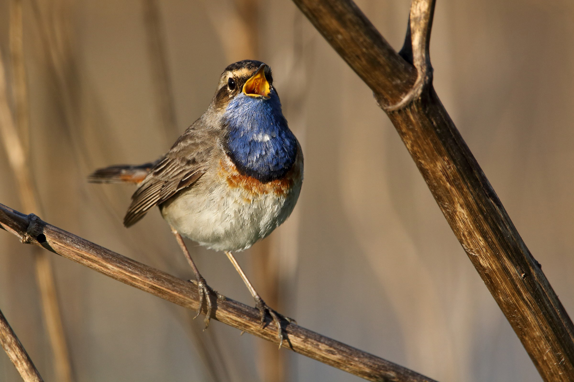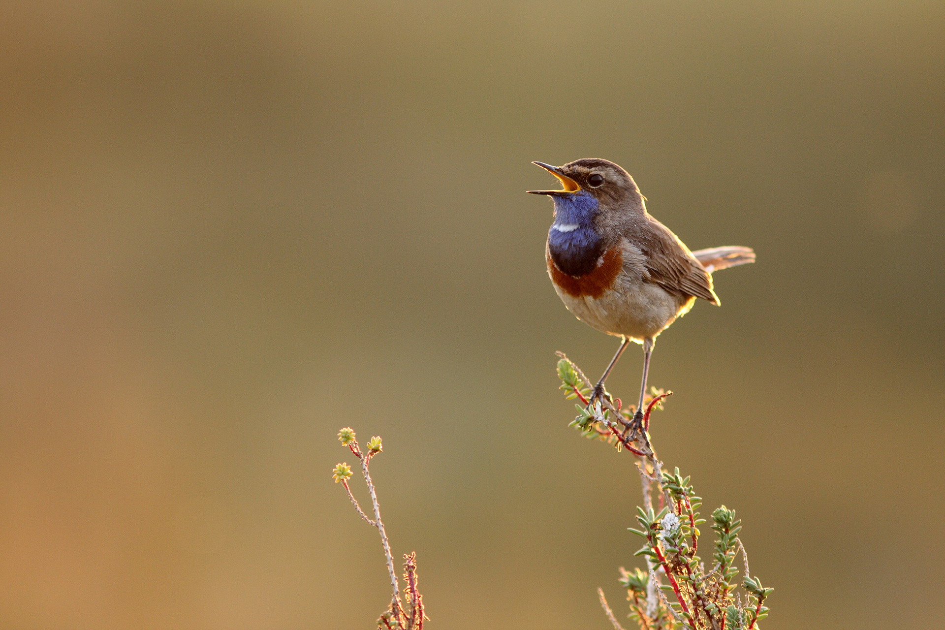 Gorgebleue à miroir blanc (Luscinia svecica) : Espèce de passereau aisément reconnaissable à sa large bavette bleue, comportant en son centre une pointe de blanc. Sa taille est de 13 à 14 cm de long pour une envergure de 22 à 23 cm environ. Enfin, son nid est en forme de coupe. Il est construit par la femelle, à terre ou dans une cavité peu élevée, avec notamment des herbes sèches, de la mousse et des feuilles mortes.