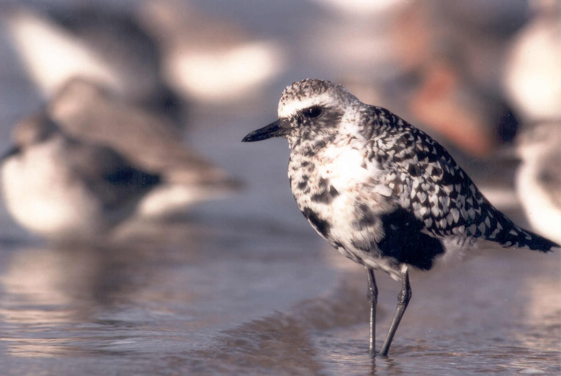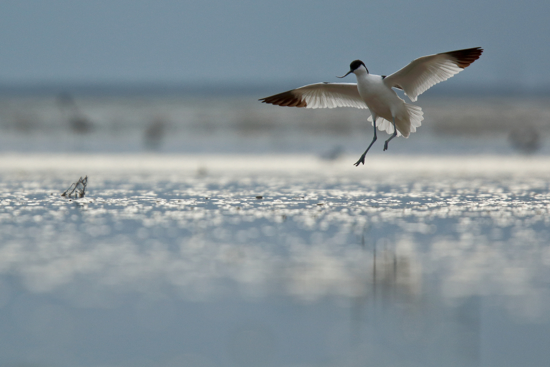 Chez les Laridés , la Guifette noire pose ses valises dans les communaux et les prairies naturelles. Elle restera jusqu’à la fin de l’été. Du côté des Anatidés , les Canards siffleurs, les Canards pilet, les Bernaches cravant ou bien les Oies cendrées, arrivés en hiver, quittent notre territoire. Tout comme la Sarcelle d’hiver , qui laisse sa place à la Sarcelle d’été . Les Limicoles sont arrivées à l’automne ne se cantonnent plus à la seule Baie et au littoral. On peut aussi les observer du côté des prairies. Ainsi, on pourra voir des Pluviers argentés, des Avocettes, des Bécasseaux variables, des Courlis cendrés, des Chevaliers gambette, des Barges à queue noire ou bien des Vanneaux huppés. Le Combattant varié fait une petite halte printanière chez nous. Il entraîne dans son sillage l’Échasse blanche .