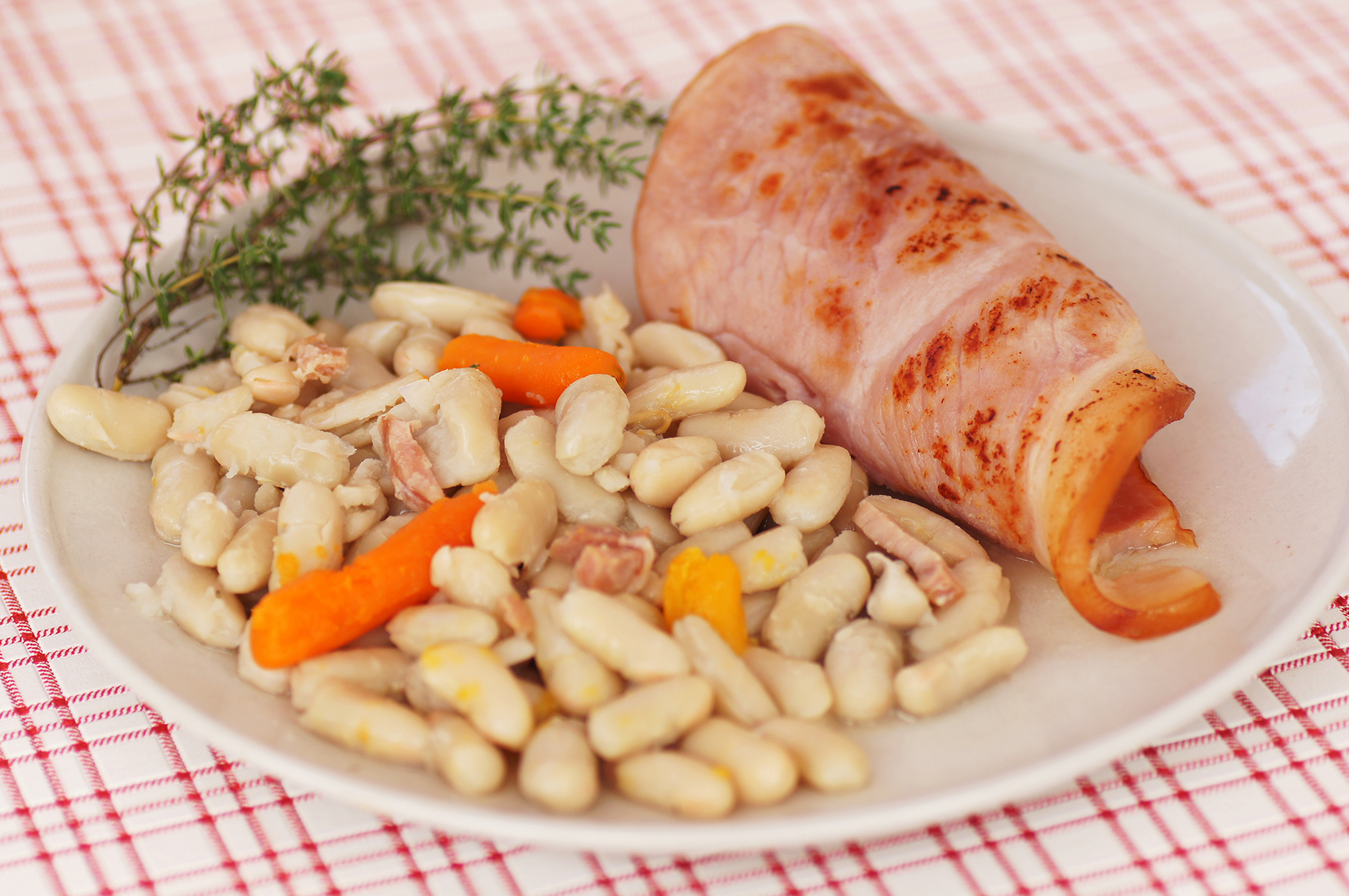 Ingrédients : Pain de campagne, ail, beurre demi-sel, persil, mogettes cuites, jambon à cuire.
