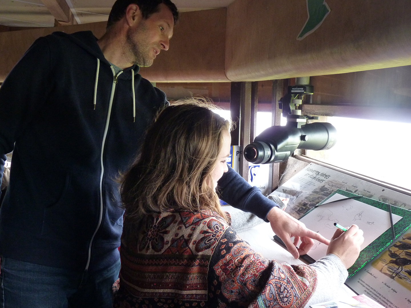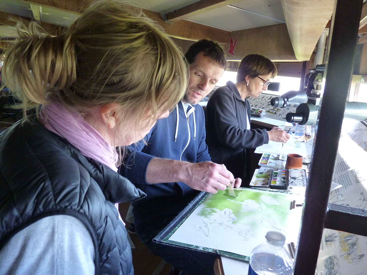 Chacun prend place avec son carnet de croquis dans l’observatoire. Les longues-vues offrent un confort d’observation incroyable. Il nous faut être rapides et efficaces puisque les oiseaux vivants, n’attendent pas qu’on ait fini notre dessin pour changer de position !